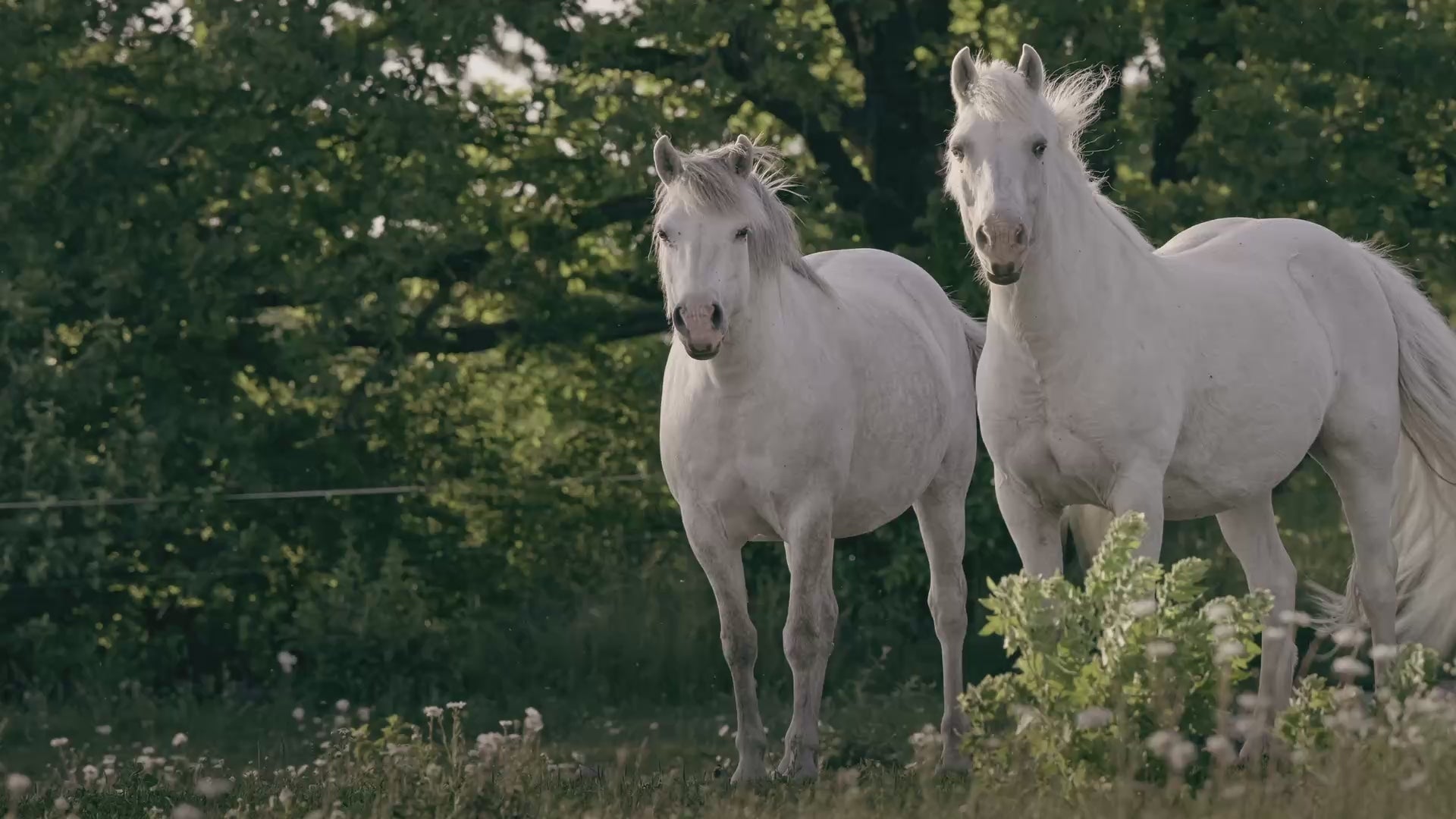Two White Horses in the Meadow – Black and White Fine Art Print