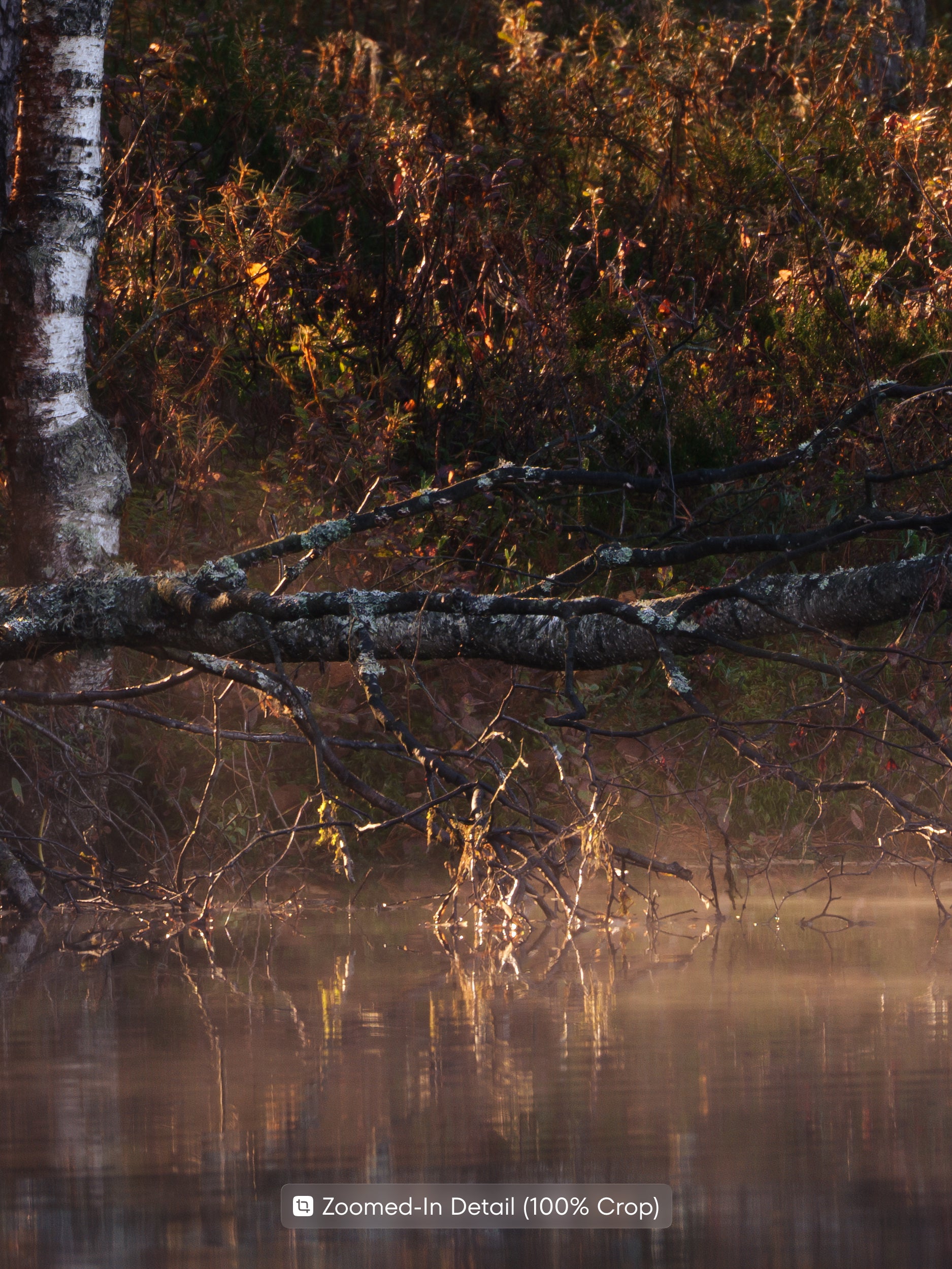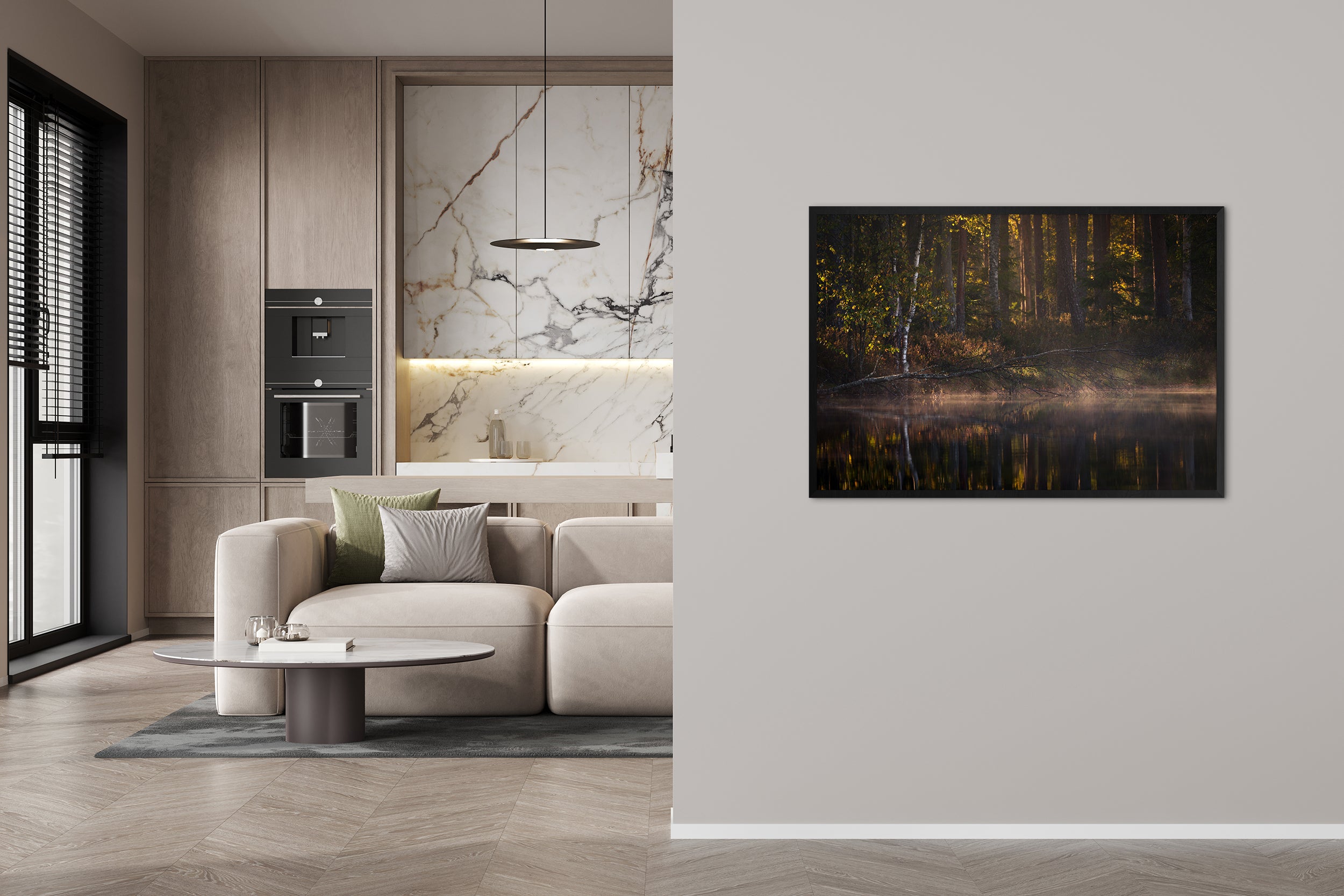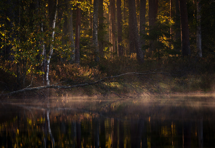 The photograph shows a forest lakeshore with birch and conifer trees illuminated by warm morning light. A fallen tree near the water and a subtle layer of mist create a calm, natural scene. This print is well suited for a living room, bedroom, or office that benefits from a warm and nature-inspired atmosphere.