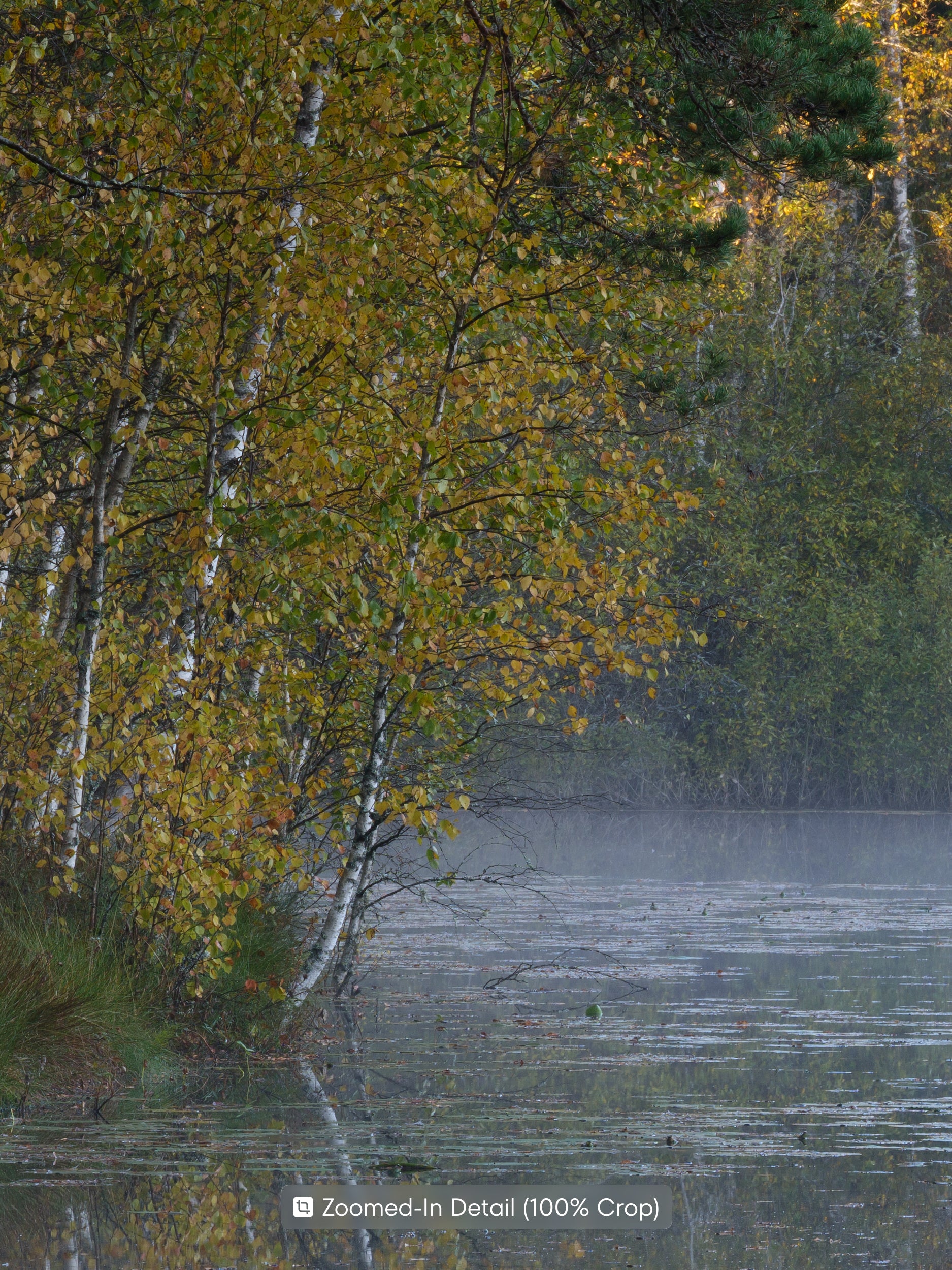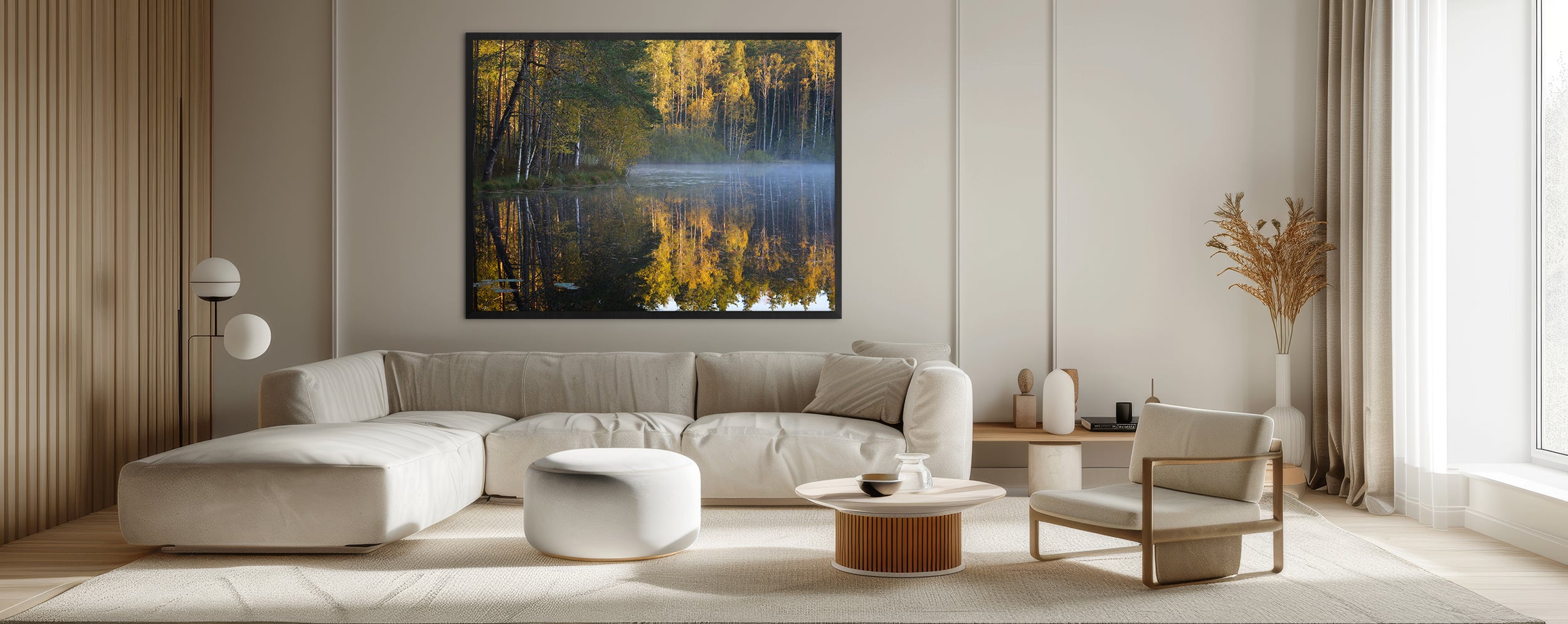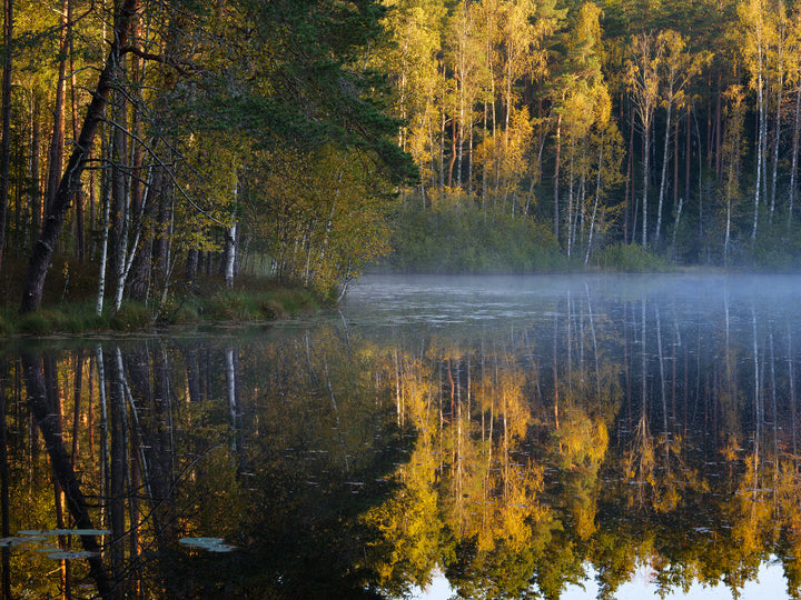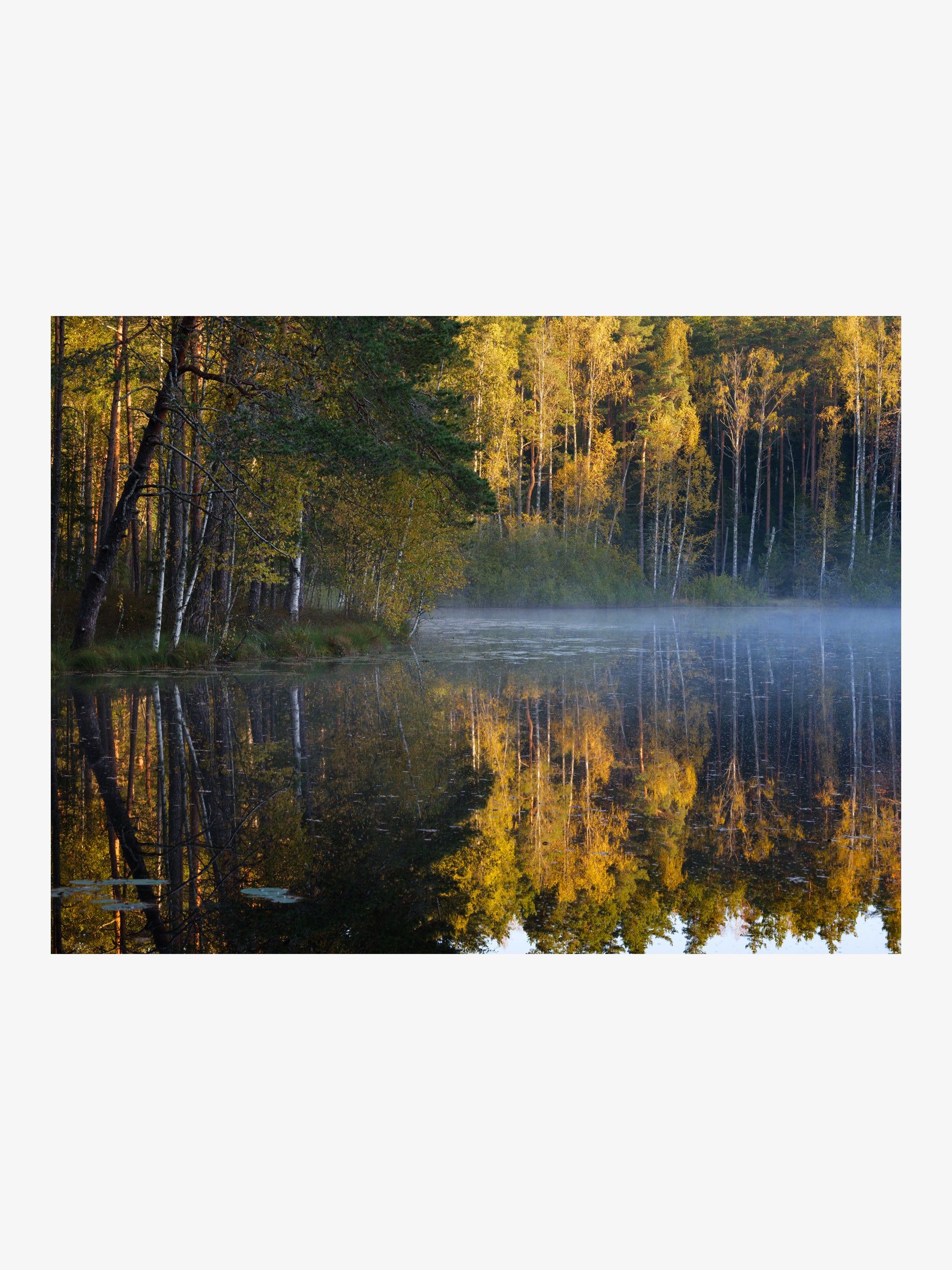 The photograph shows a forest lake reflecting birch and conifer trees in warm autumn colors. A light layer of mist above the water softens the light and enhances the mirror-like surface. This print works well in a living room, bedroom, or office where a warm natural accent is desired.