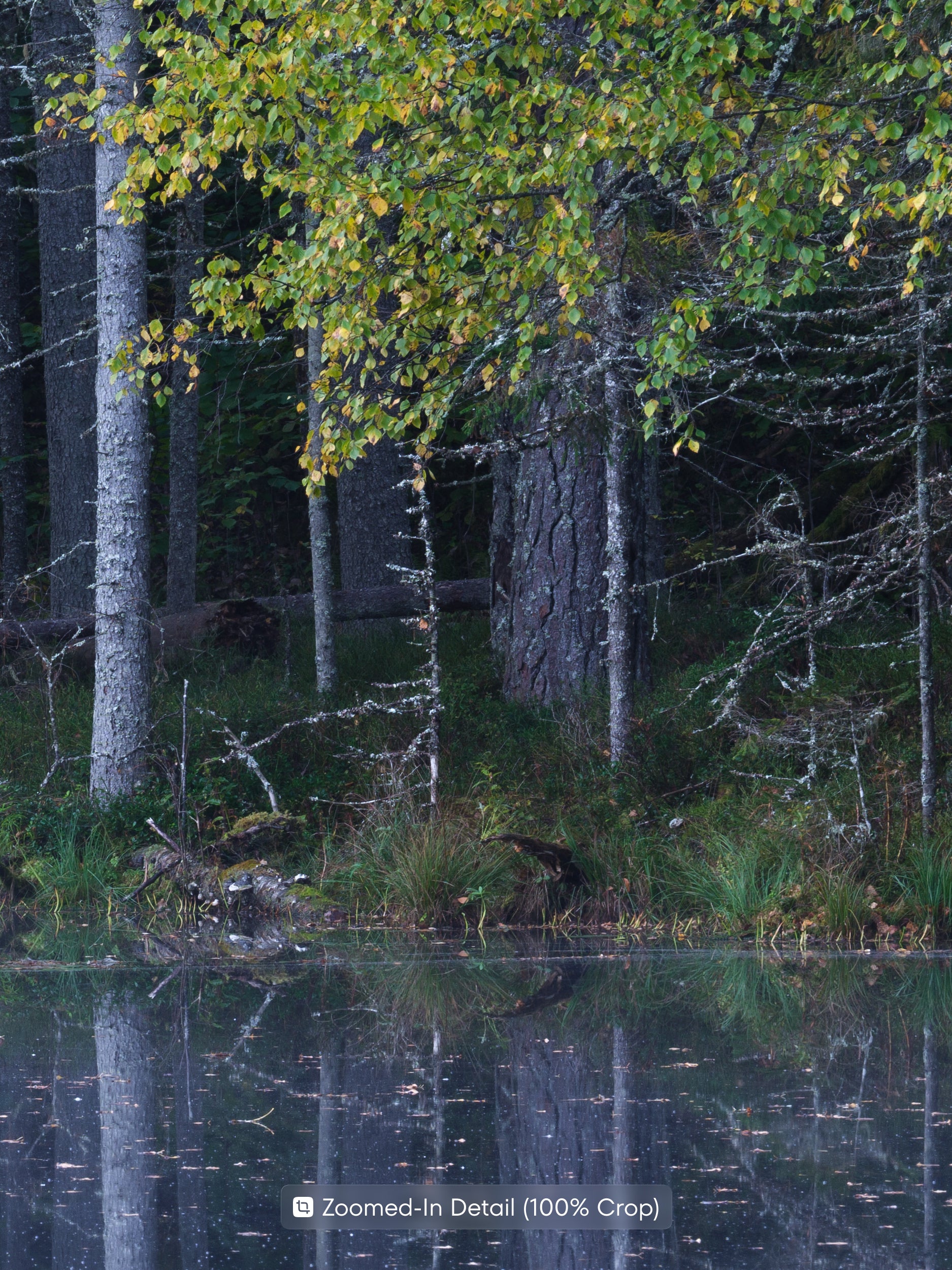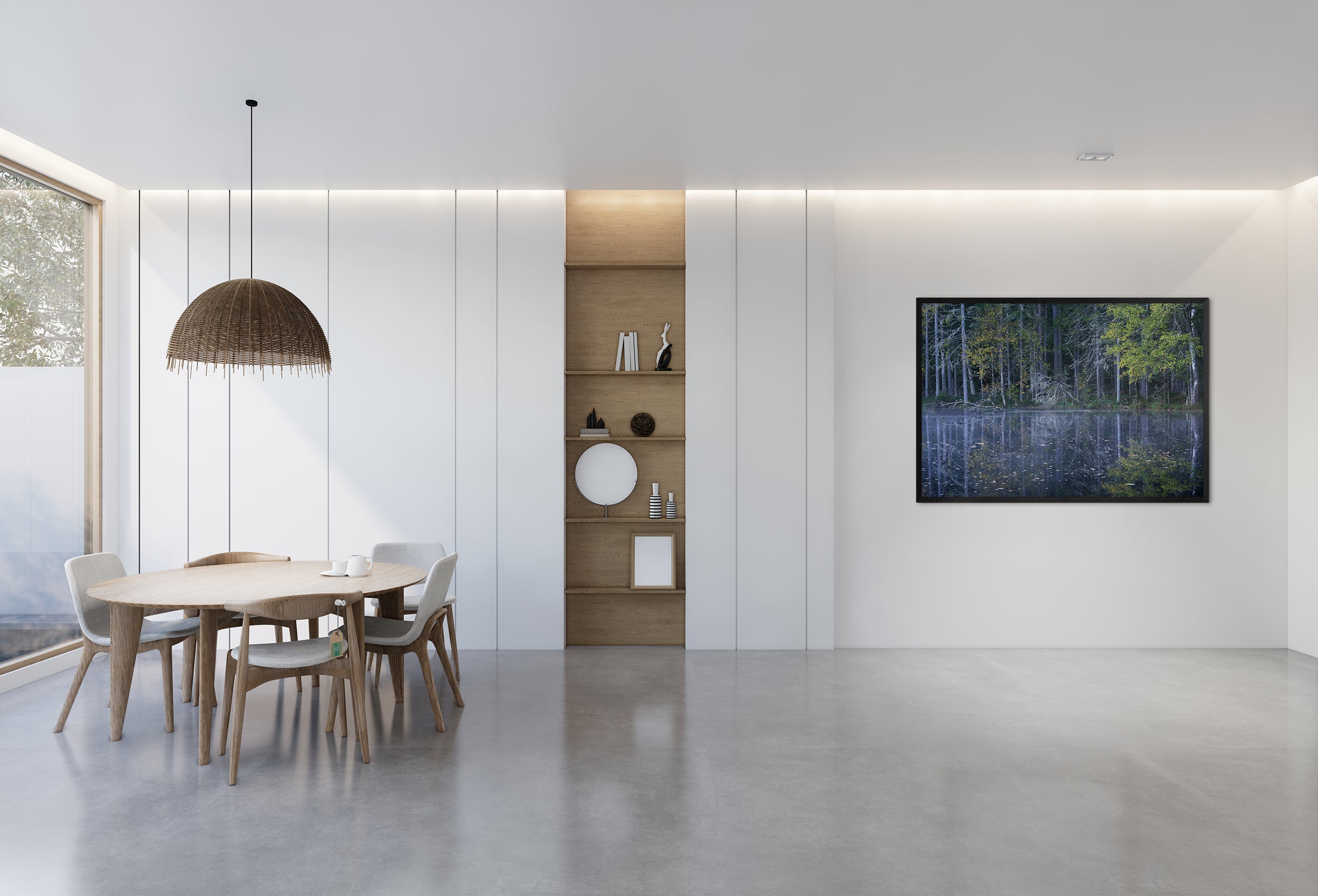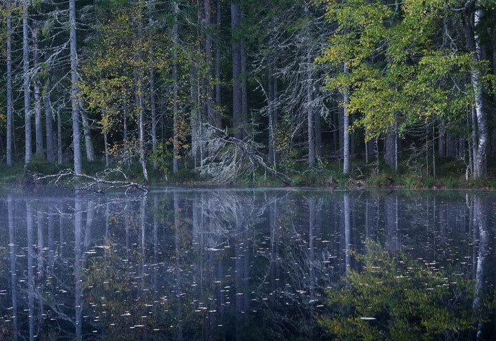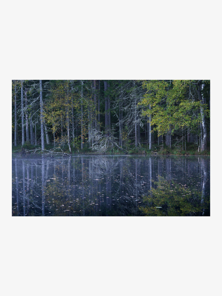 The photograph features a calm forest scene with trees reflected in the dark surface of a quiet lake. Subtle autumn foliage in muted yellow and green tones is complemented by a light mist above the water. This print is well suited for a living room, bedroom, or office where a calm natural mood is desired.