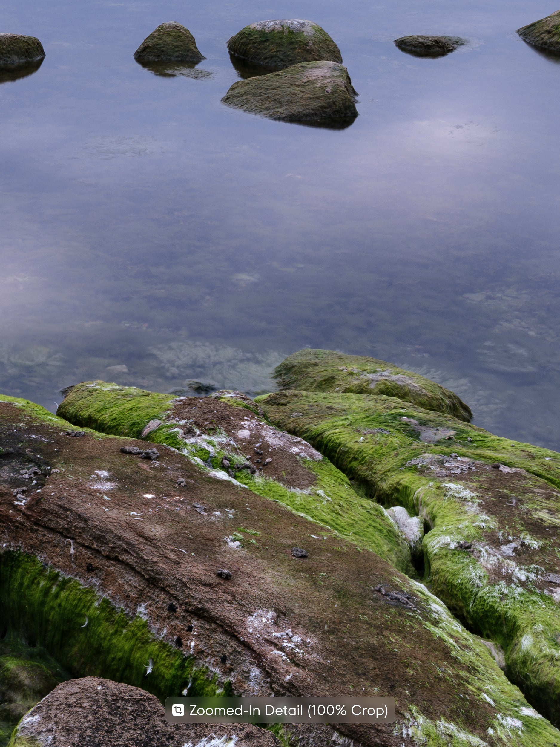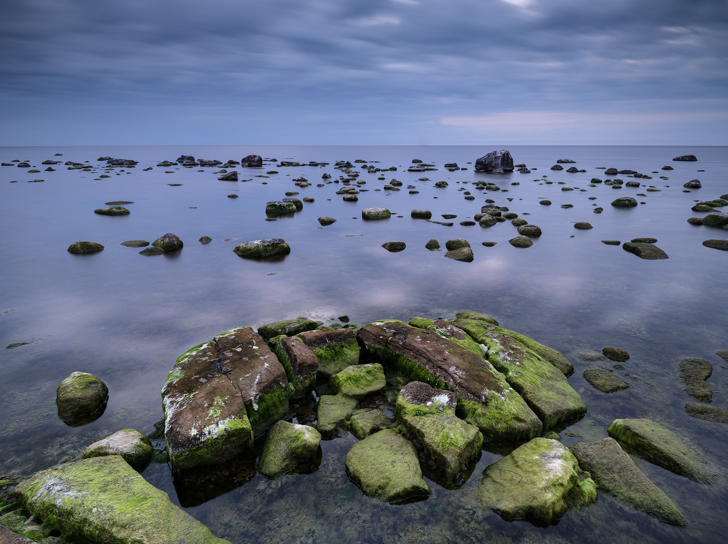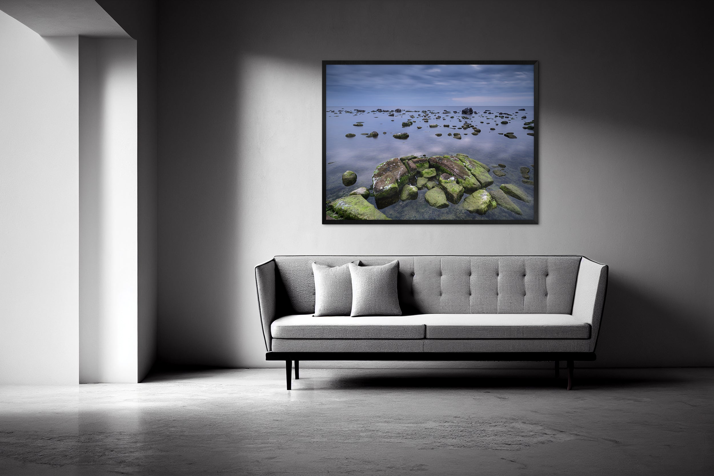 A tranquil Baltic seascape under a calm, clouded sky. Moss-covered stones rest in the still water, evoking a sense of peace and cool northern light. The soft clouds and gentle reflections create a meditative, timeless atmosphere – perfect for minimalist or Scandinavian-inspired interiors.
