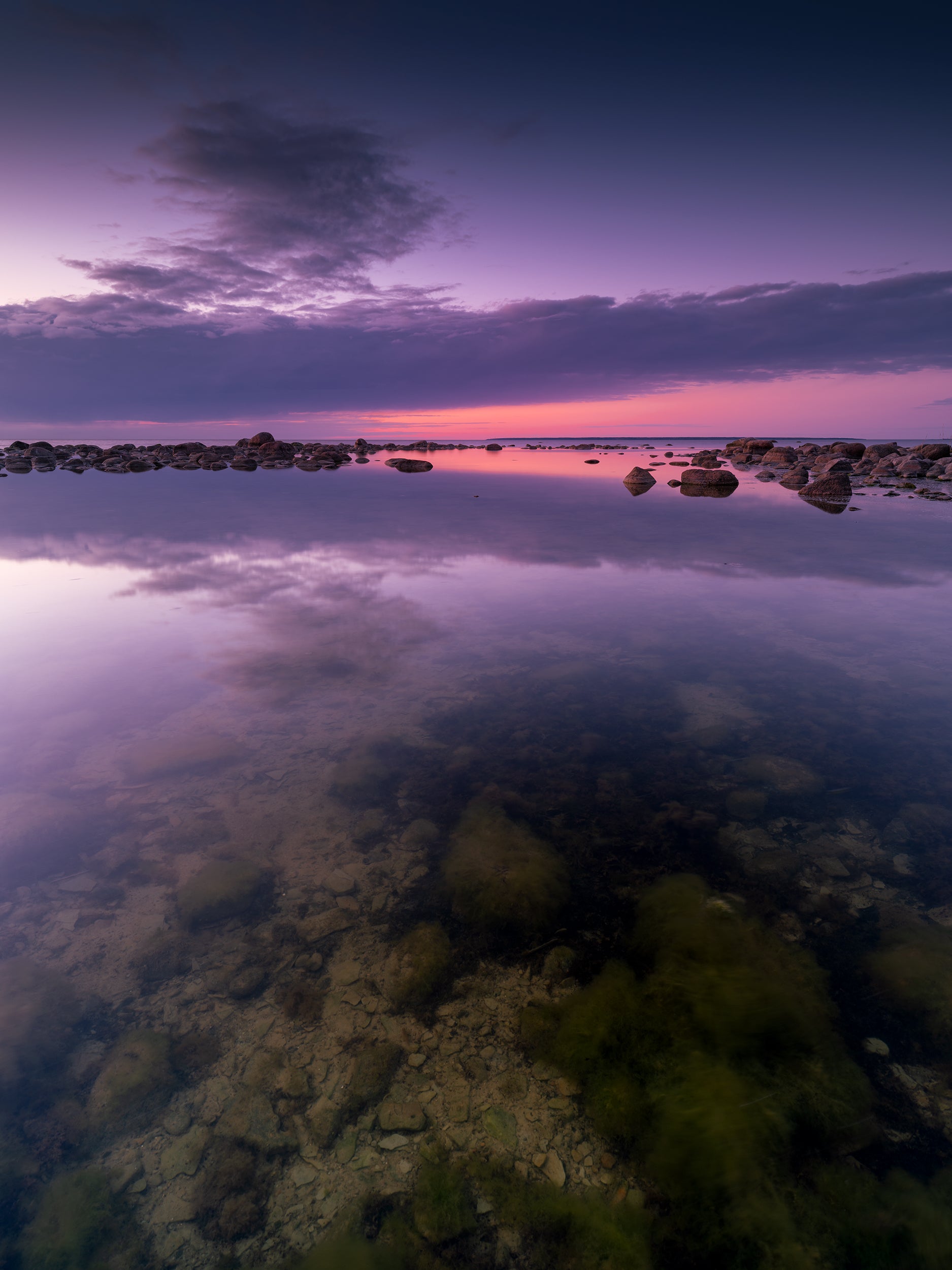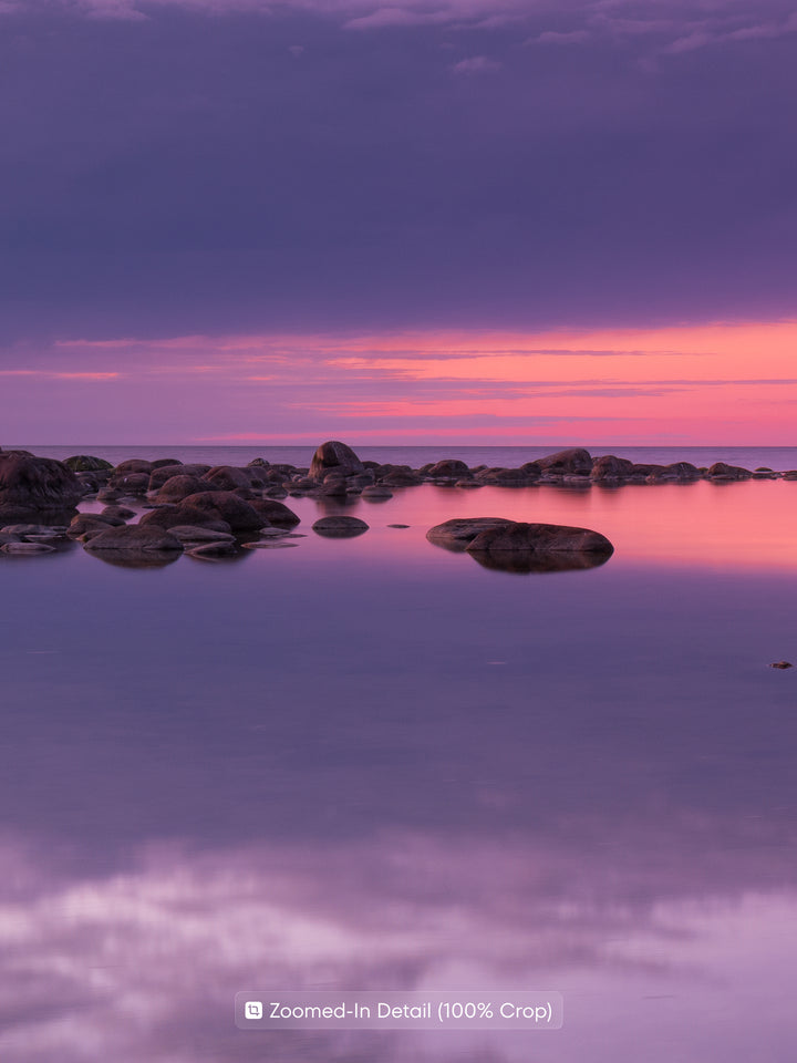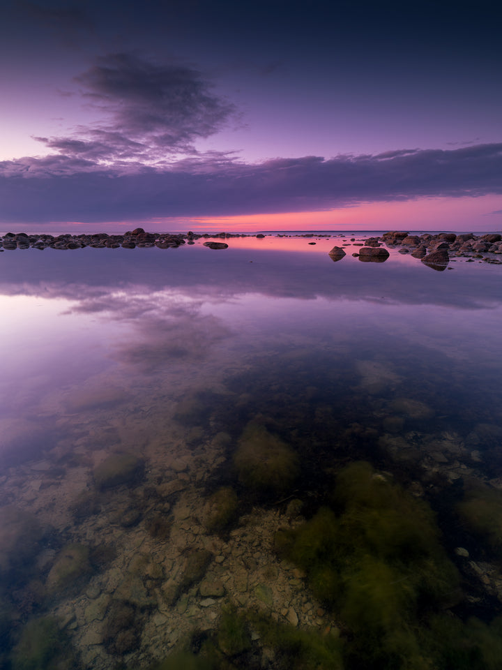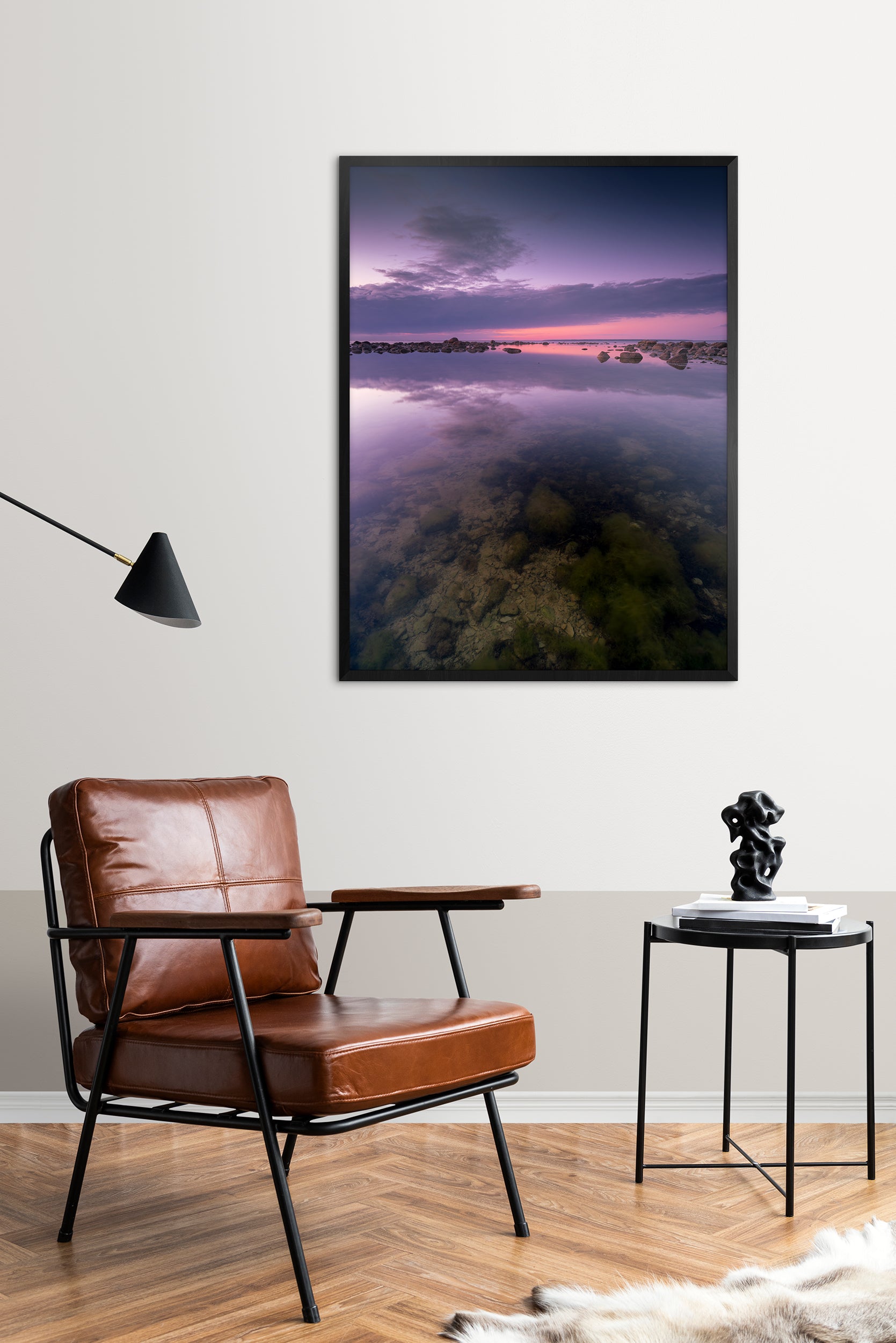 A peaceful Baltic seascape captured at sunset, with soft pink and violet tones reflected on the calm water. The shallow stones and clear reflections convey depth and serenity. Perfect for modern or Scandinavian interiors, bringing warmth and balance to a living room, bedroom, or workspace.