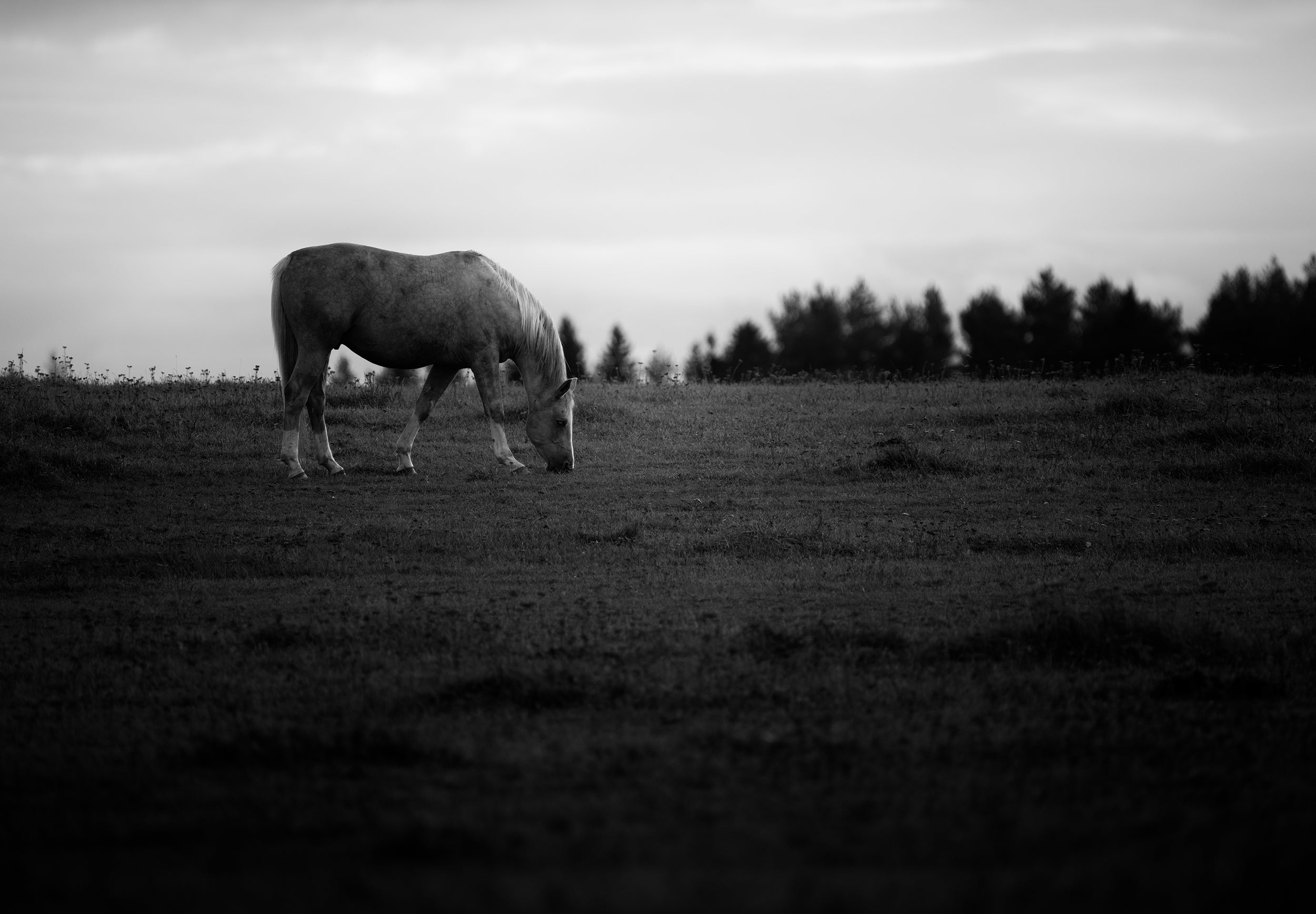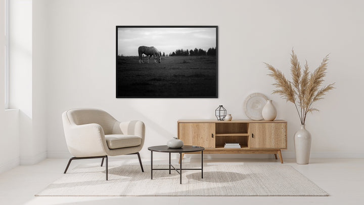 A black and white photograph of a bay horse grazing in an open field under the evening sky. The soft light and calm stance evoke balance and natural serenity. This Fine Art Print brings quiet strength and timeless elegance to modern interiors.