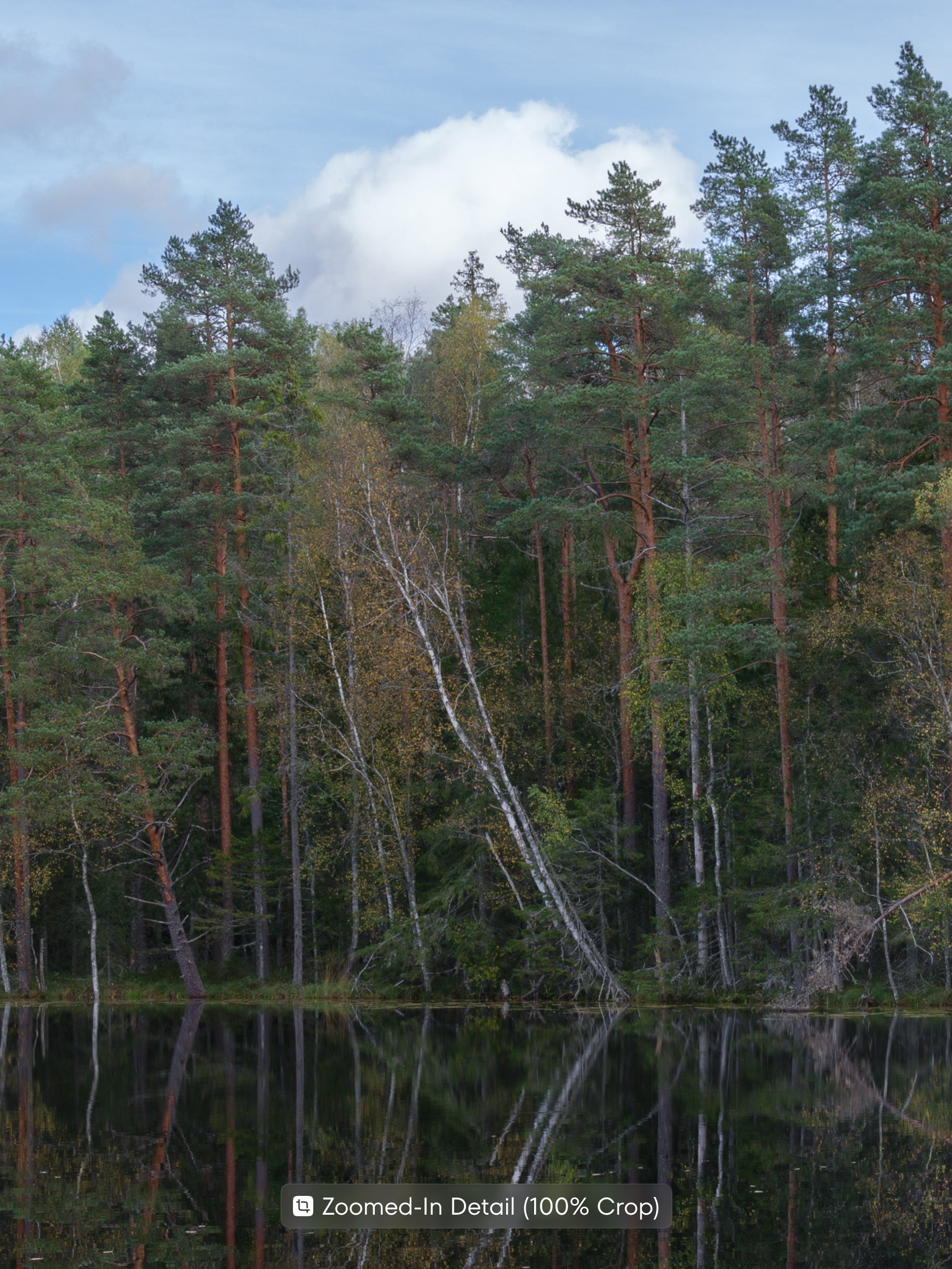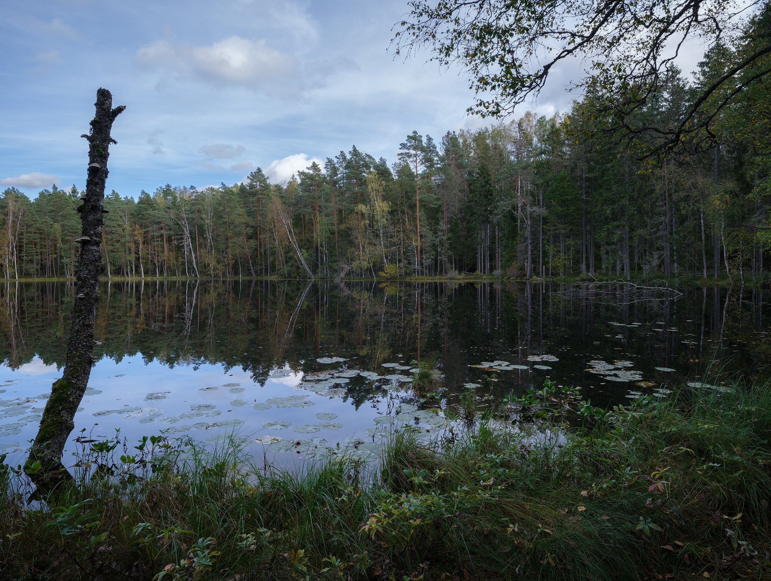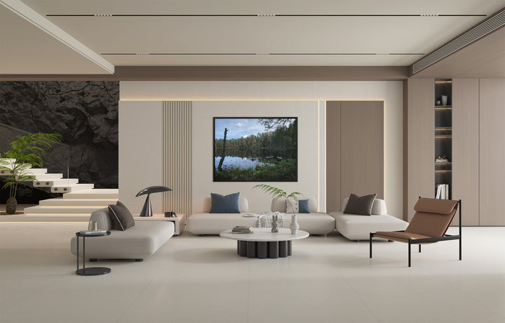 The photograph shows a calm forest lake with a mirror-like surface reflecting a mixed pine and birch forest along the shore. Water lilies, shoreline grass, and open sky add a sense of space and stillness to the scene. This print is well suited for a living room, bedroom, or office where a balanced natural atmosphere is desired.
