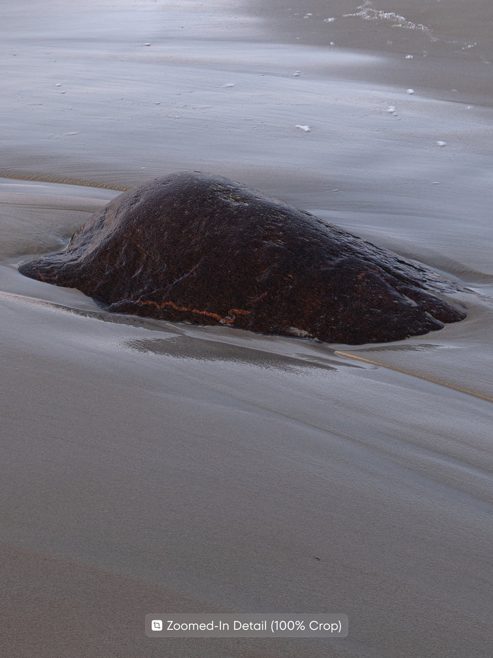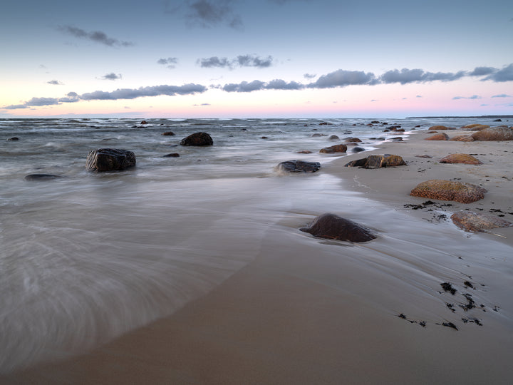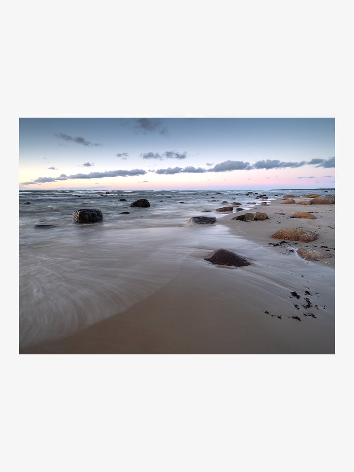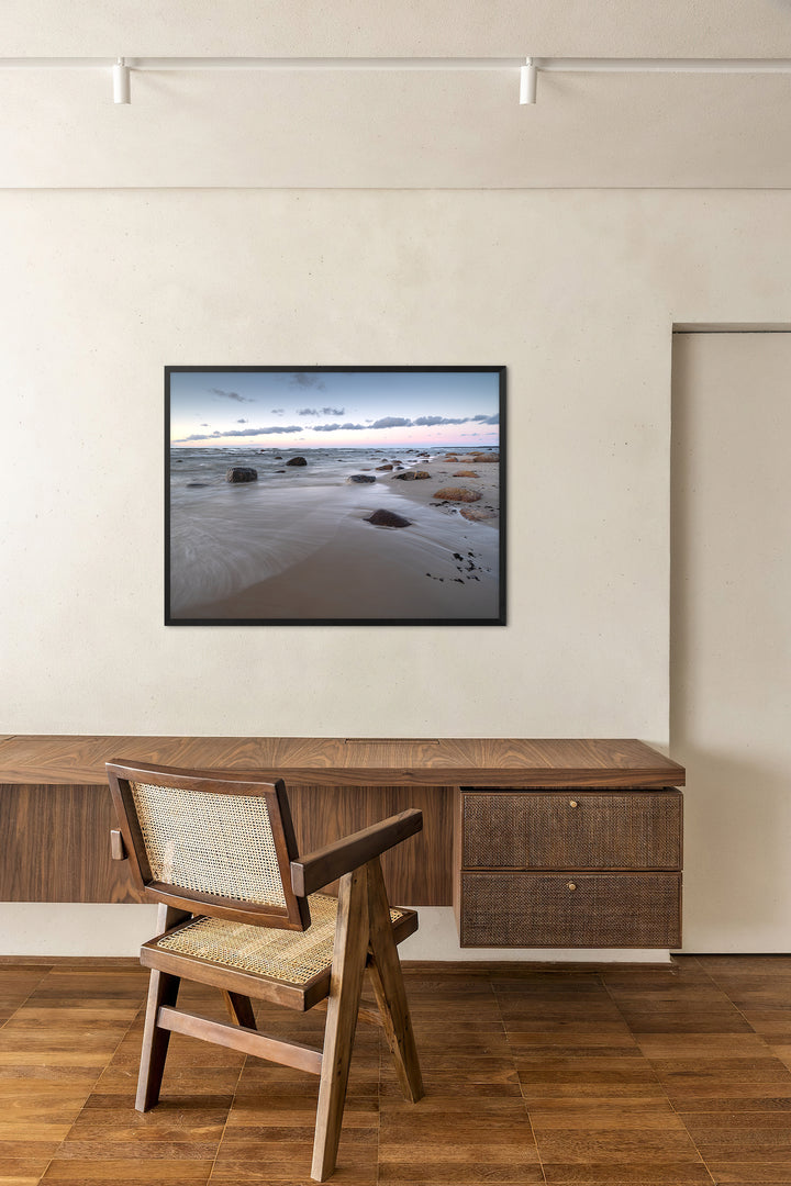 A serene coastal scene featuring large stones on the sandy shore with soft waves and a pastel sunset sky. Gentle tones of the horizon and flowing water bring a sense of tranquility and lightness. Perfect for a living room, bedroom, or office, adding freshness and openness to any space.