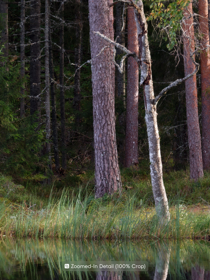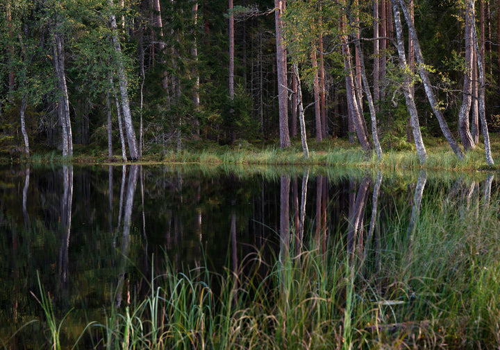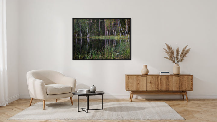 The photograph shows a calm forest lake shoreline with birch and pine trees reflected in dark water. Vertical tree trunks and soft shoreline grass create a balanced and natural composition. This print is well suited for a living room, bedroom, or office that benefits from a natural and tranquil atmosphere.