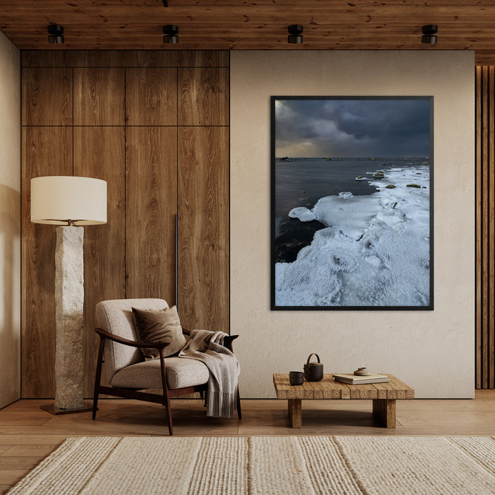 A striking winter seascape featuring an icy shoreline, scattered rocks, and dramatic storm clouds over the dark sea. The cool palette of blues and grays conveys both power and tranquility. Ideal for modern, minimalist, or Scandinavian interiors in a living room, study, or office.