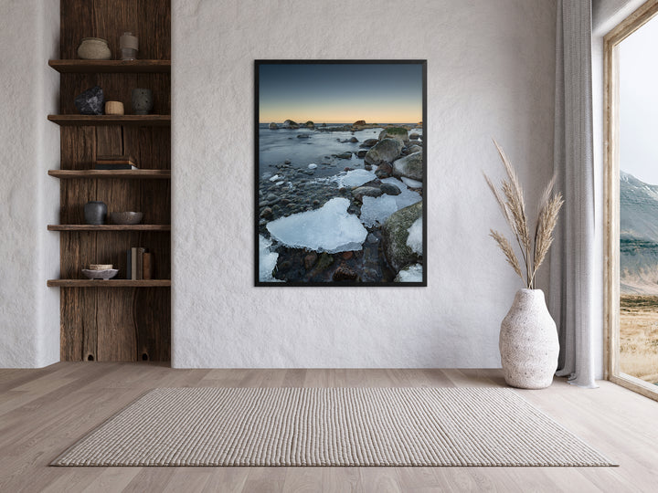 A tranquil northern seascape captured at sunrise, featuring icy rocks along the Baltic coast. The warm morning light meets the cool tones of ice and sea, evoking freshness and calm. Perfect for modern, minimalist, or Scandinavian interiors – ideal for a living room, bedroom, or workspace.
