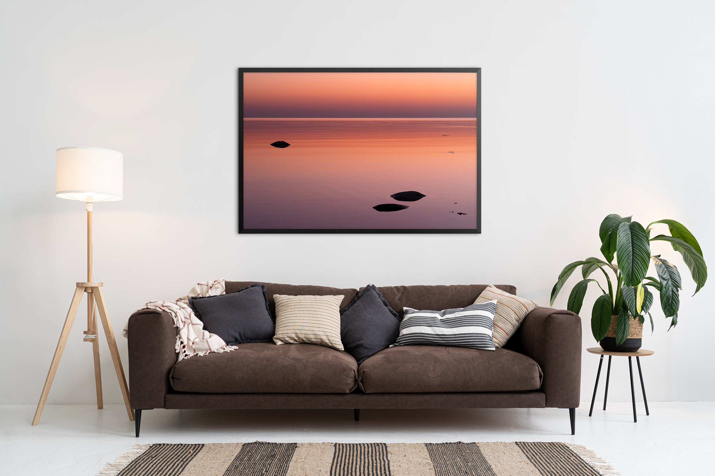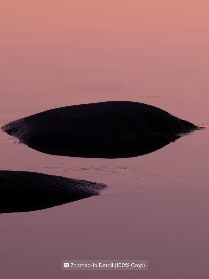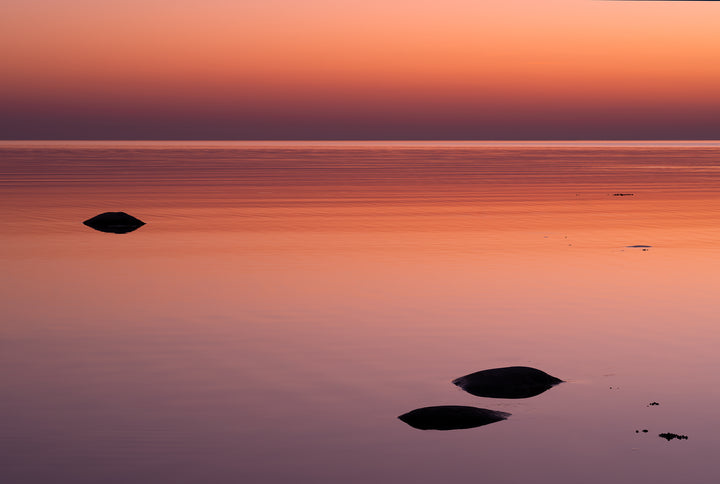 A minimalist seascape with smooth color transitions from warm orange to soft pink tones. The calm water and a few visible rocks evoke a sense of space and balance. Perfect for a bedroom, living room, or office, bringing a gentle and peaceful atmosphere to the space.