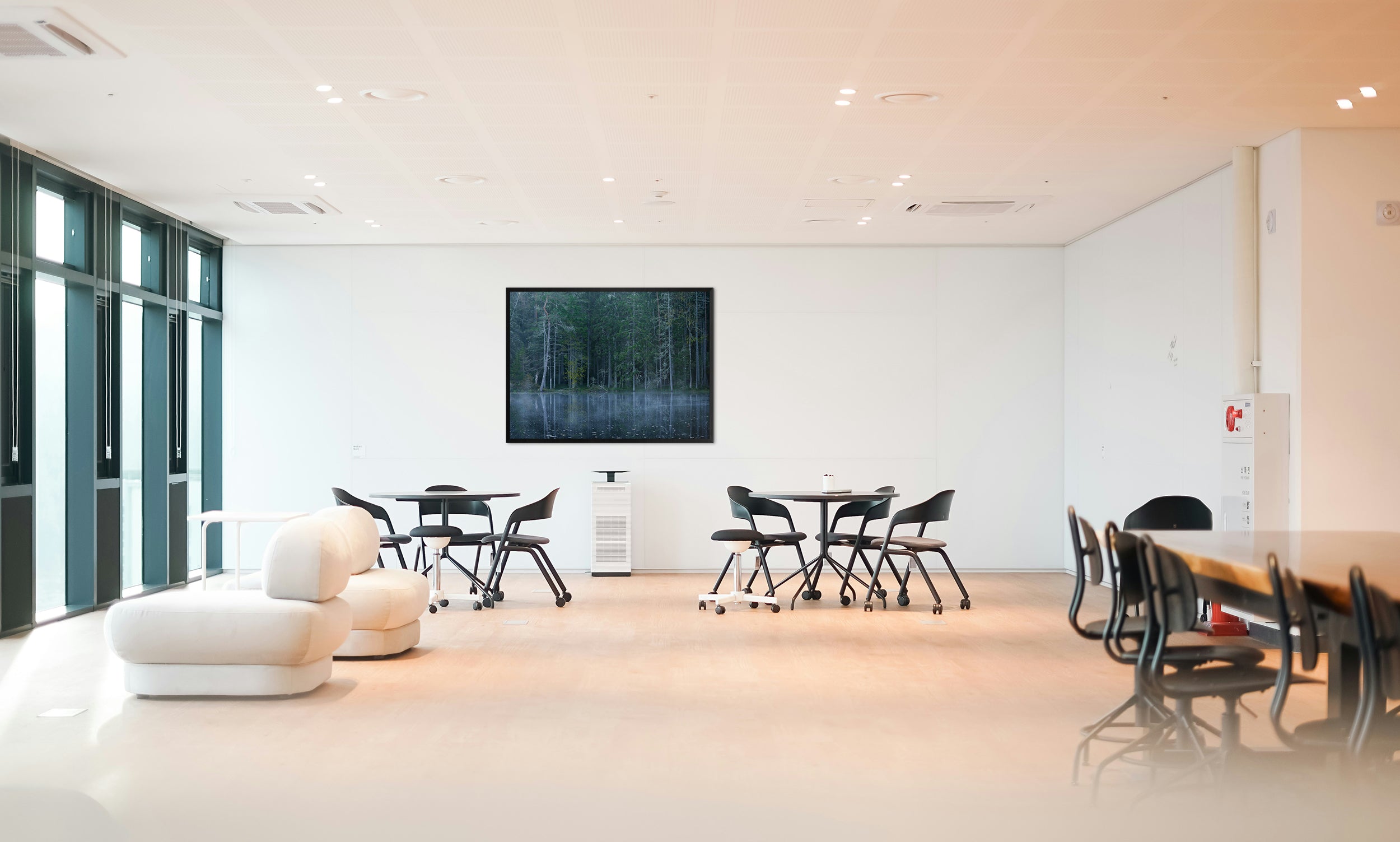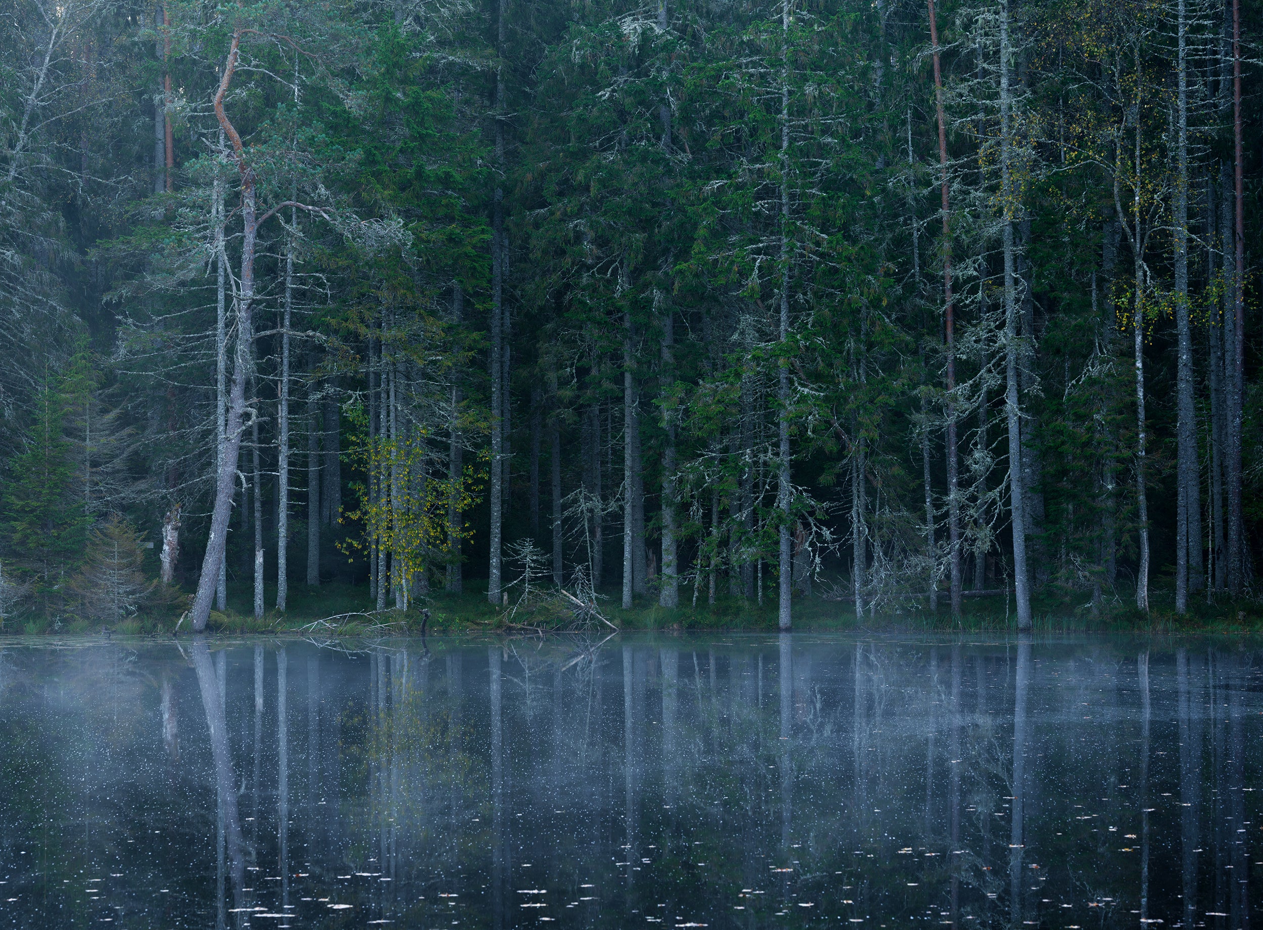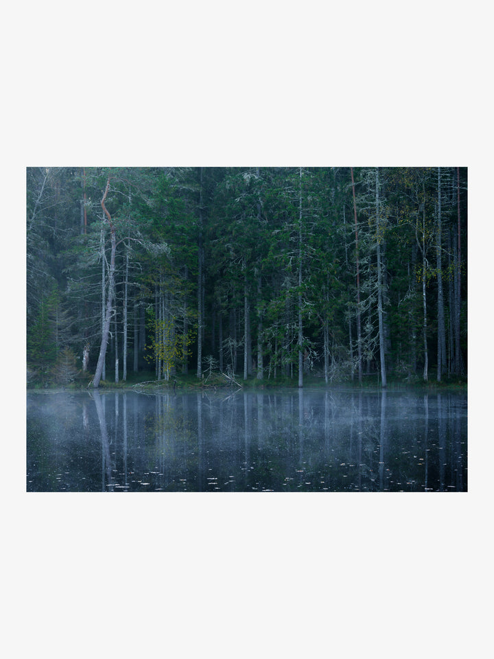 The photograph shows a dense conifer forest along a lakeshore reflected in dark water covered by a light layer of morning mist. Vertical tree lines and soft fog create a calm, balanced composition. This print works well in a living room, bedroom, or office where a quiet natural scene is preferred.