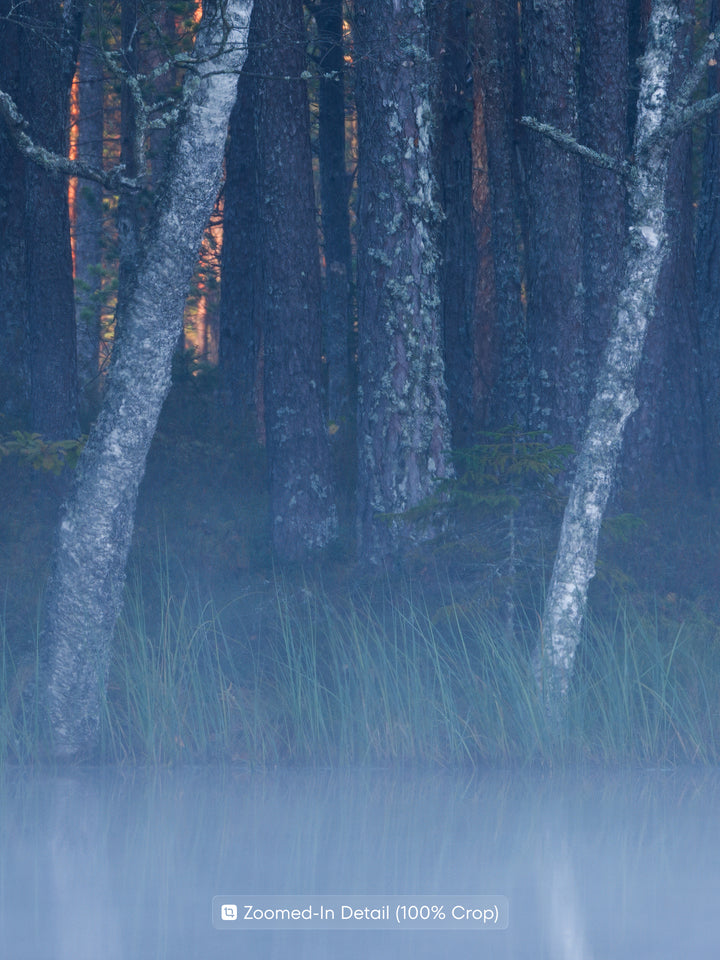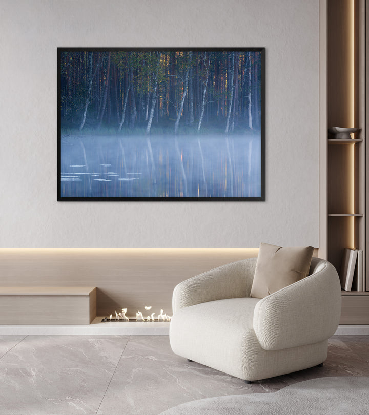 The image shows a quiet forest scene with birch trees standing along the water’s edge and reflecting in the still lake. A light layer of mist above the surface adds a calm, secluded mood, enhanced by cool blue and green tones. This wall print is a great choice for a living room, bedroom, or office where a natural and peaceful accent is desired.