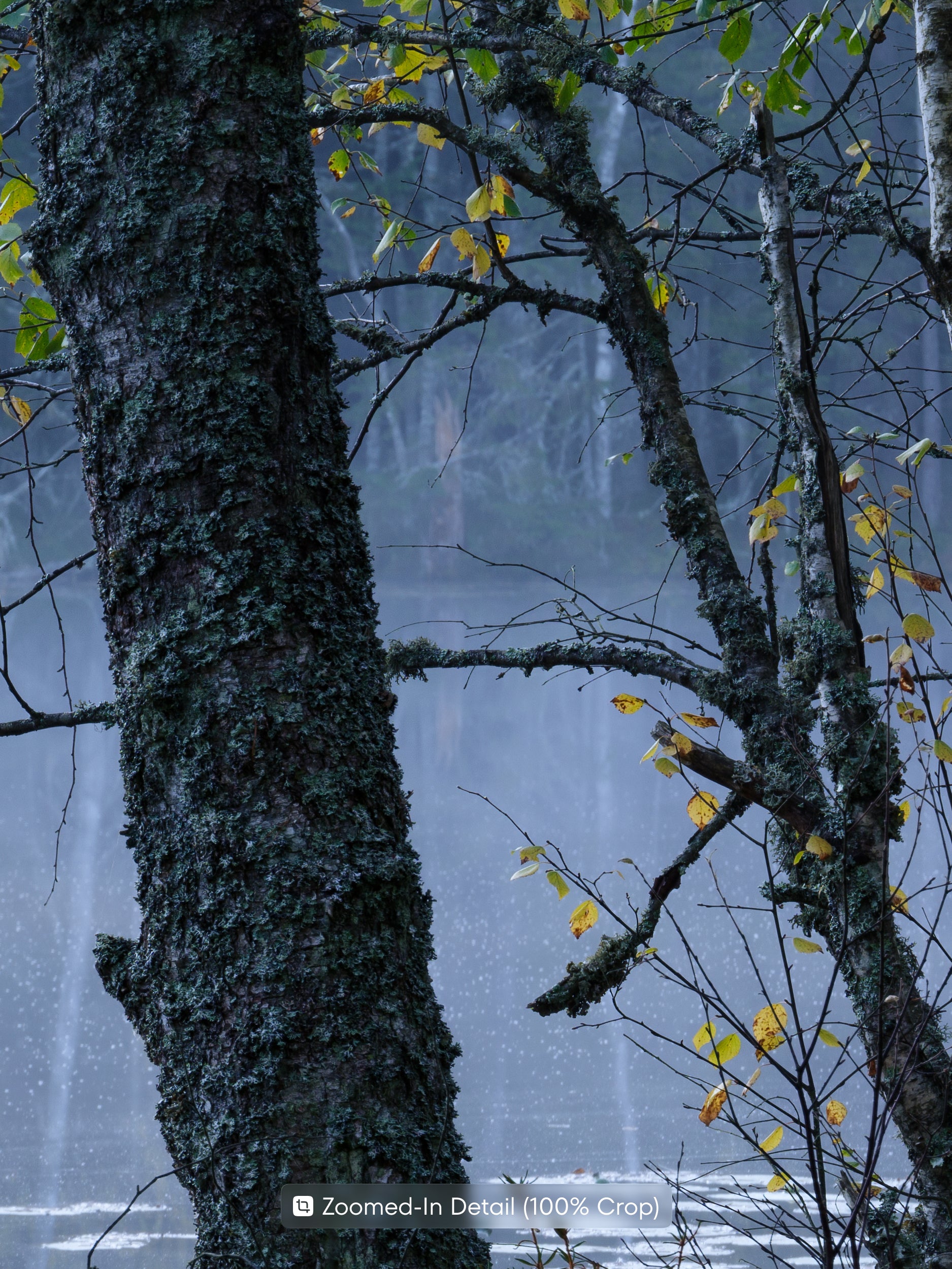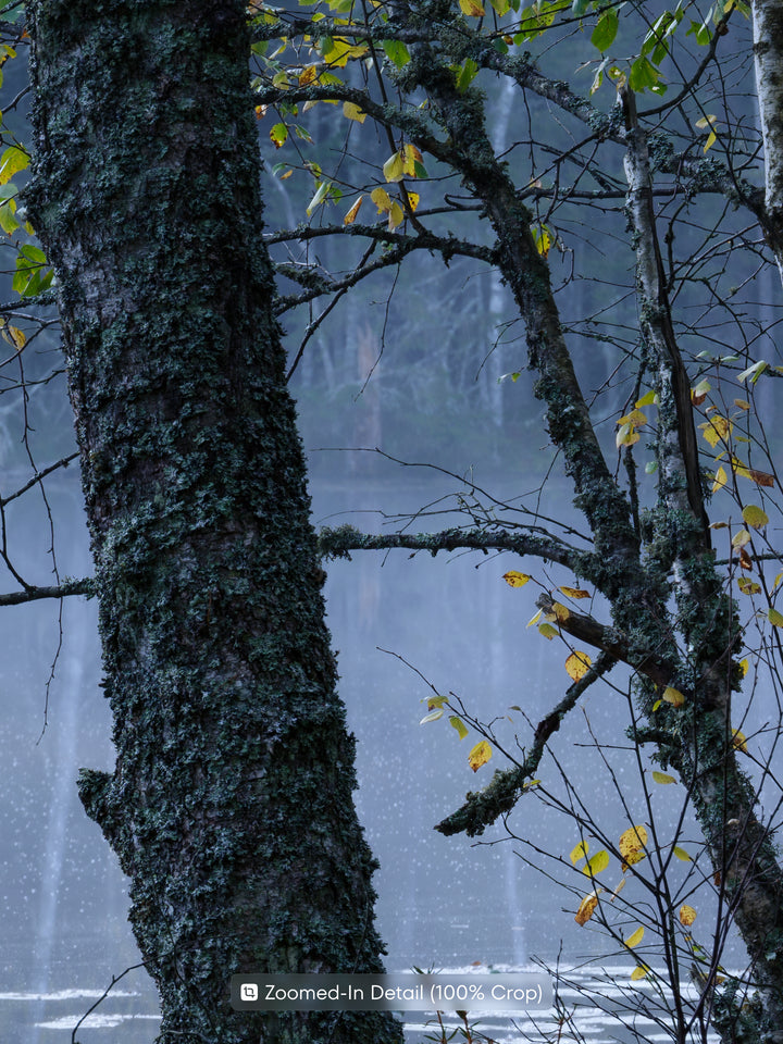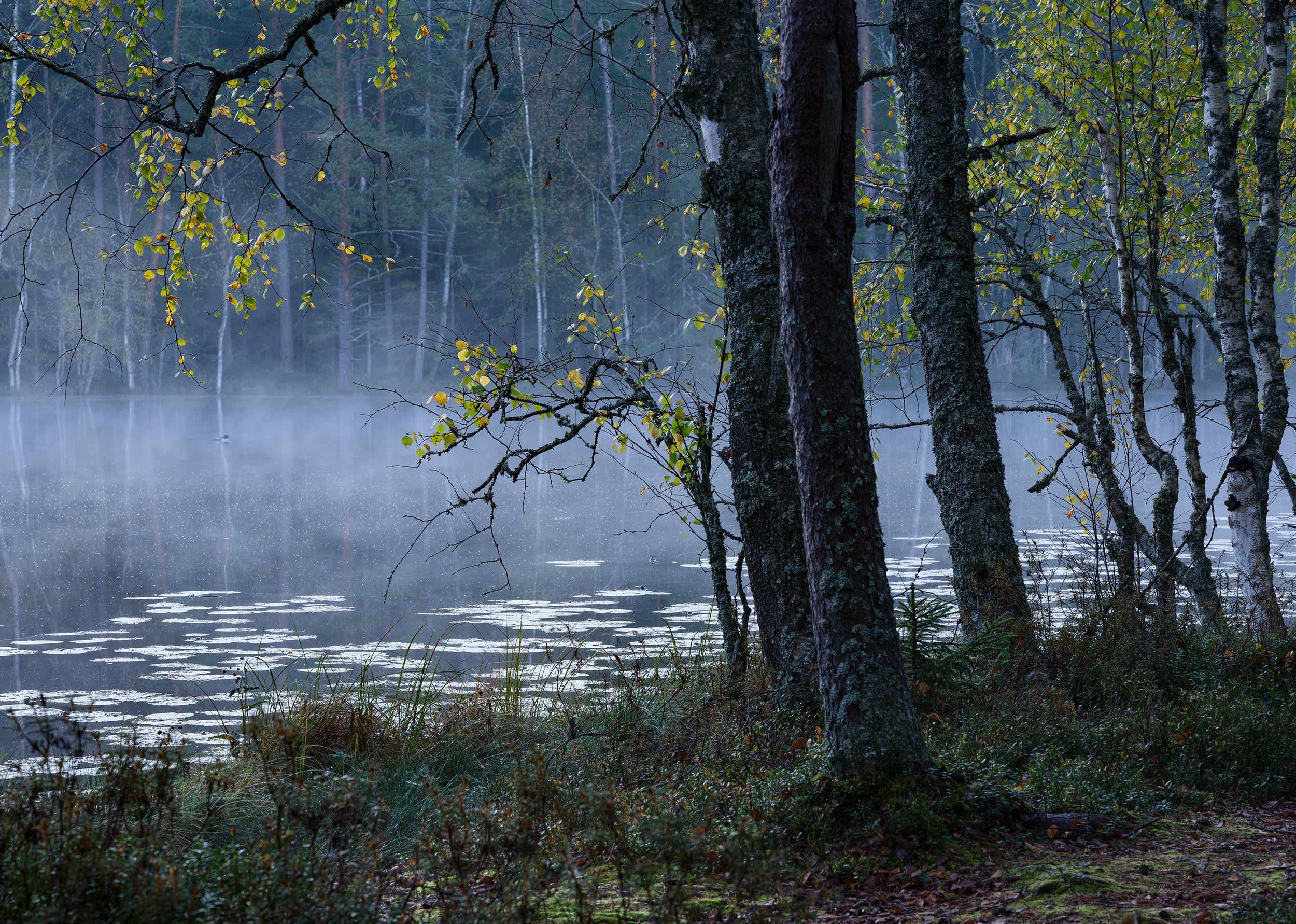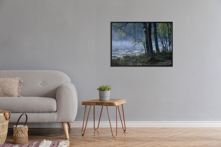 The photograph shows a forest lakeshore with birch trees and moss-covered trunks in the foreground. A layer of morning mist drifts across the water, softly obscuring the distant forest and adding depth to the scene. This print works well in a living room, bedroom, or relaxation area that benefits from a calm natural setting.