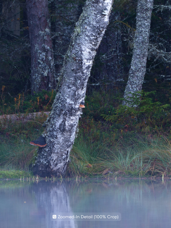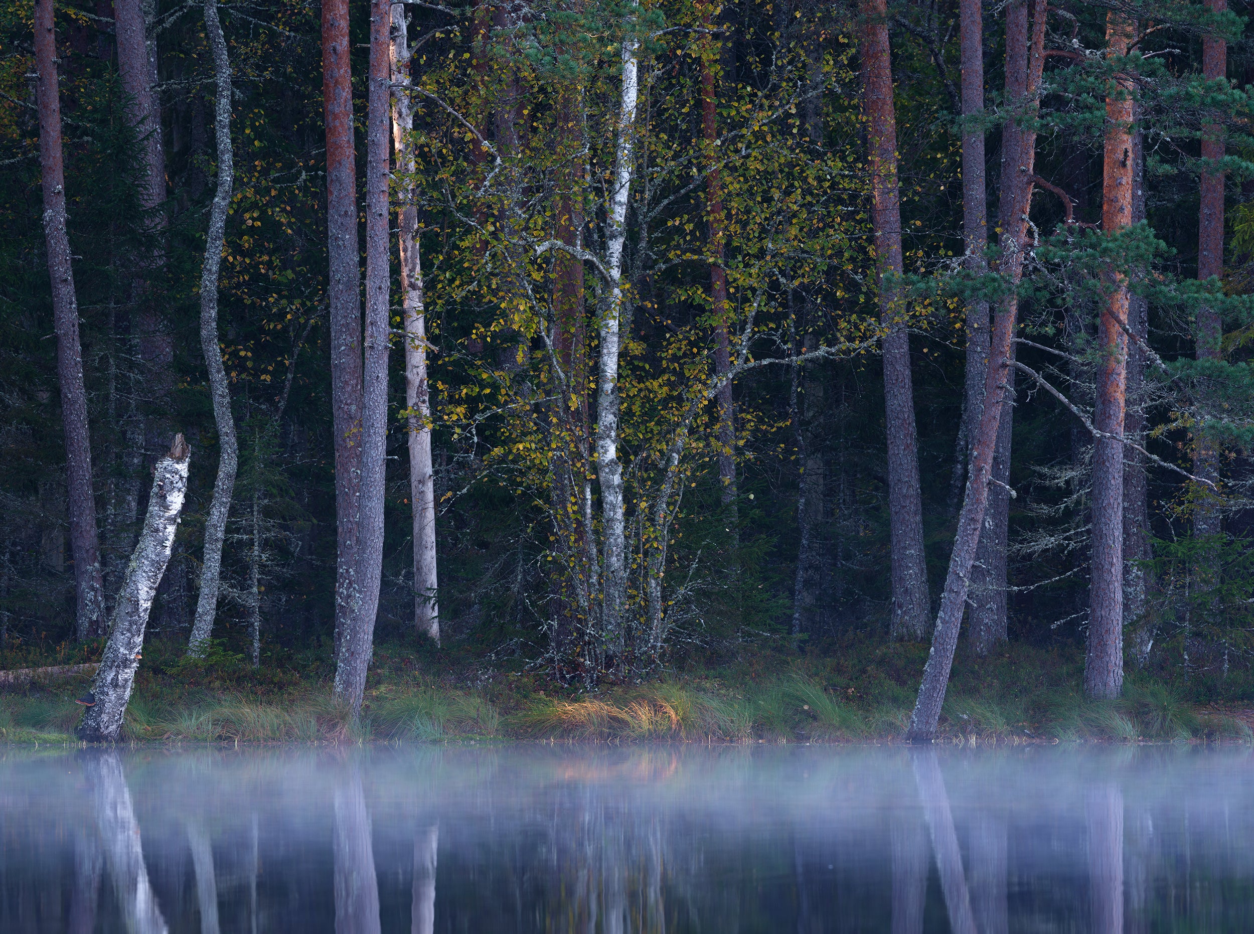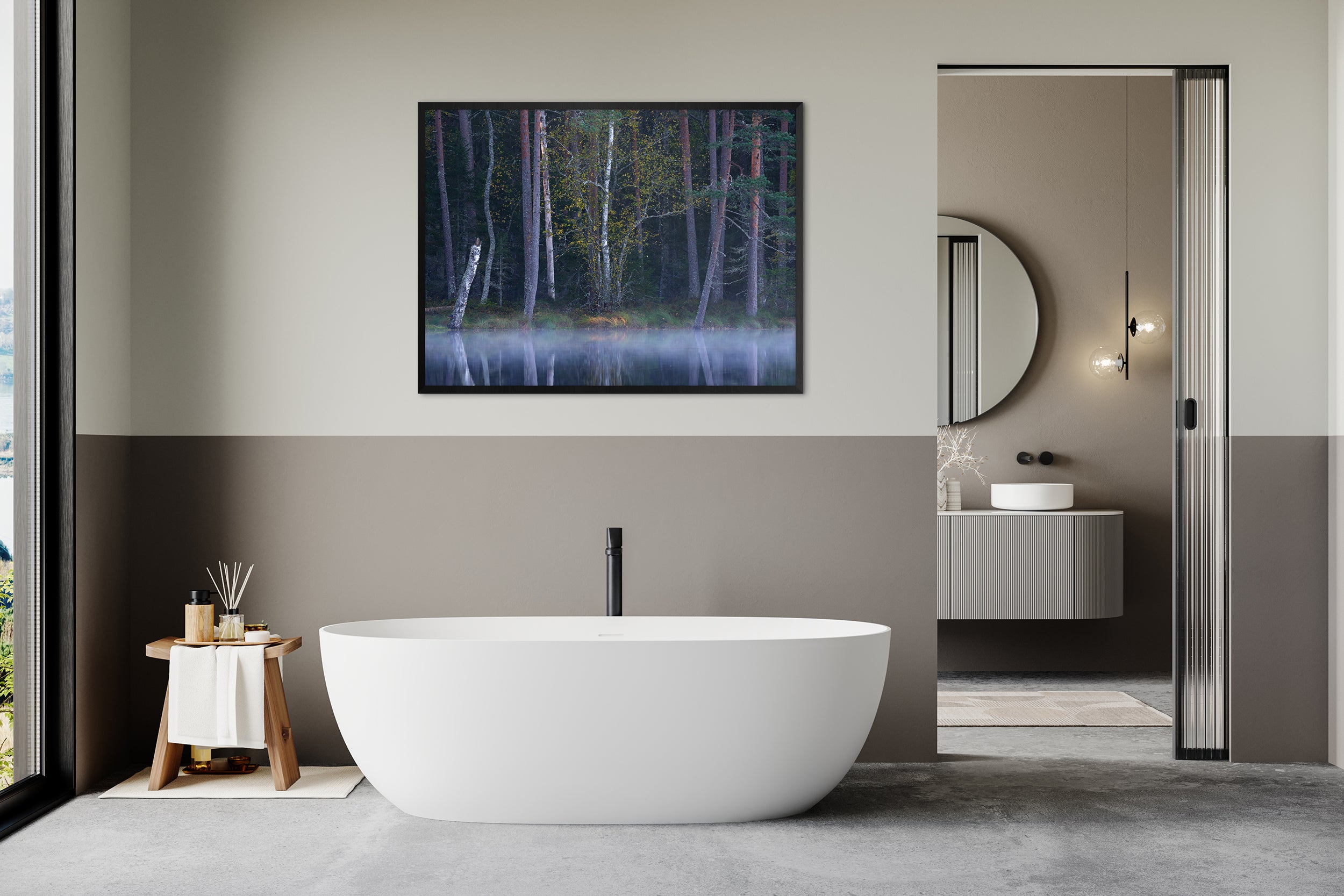 The photograph shows a forest lakeshore with birch and pine trees reflected in calm water covered by a thin layer of mist. Cool tones and vertical tree lines create a quiet, balanced composition. This print is well suited for a living room, bedroom, or office that benefits from a calm natural mood.
