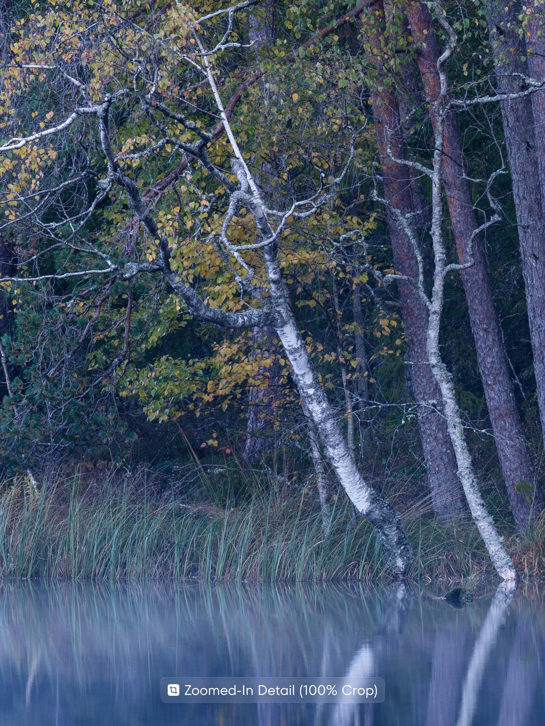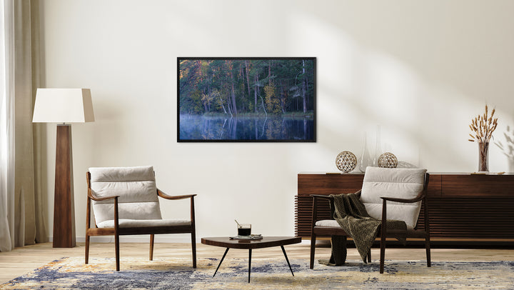 The photograph shows a lakeshore lined with pine forest and scattered birch trees reflected in calm water. A light layer of morning mist softens the scene and creates a balanced, tranquil composition. This print works well in a living room, bedroom, or office where a calm natural atmosphere is desired.