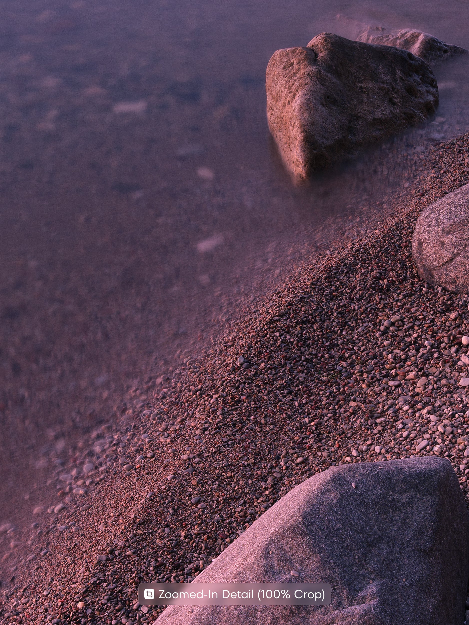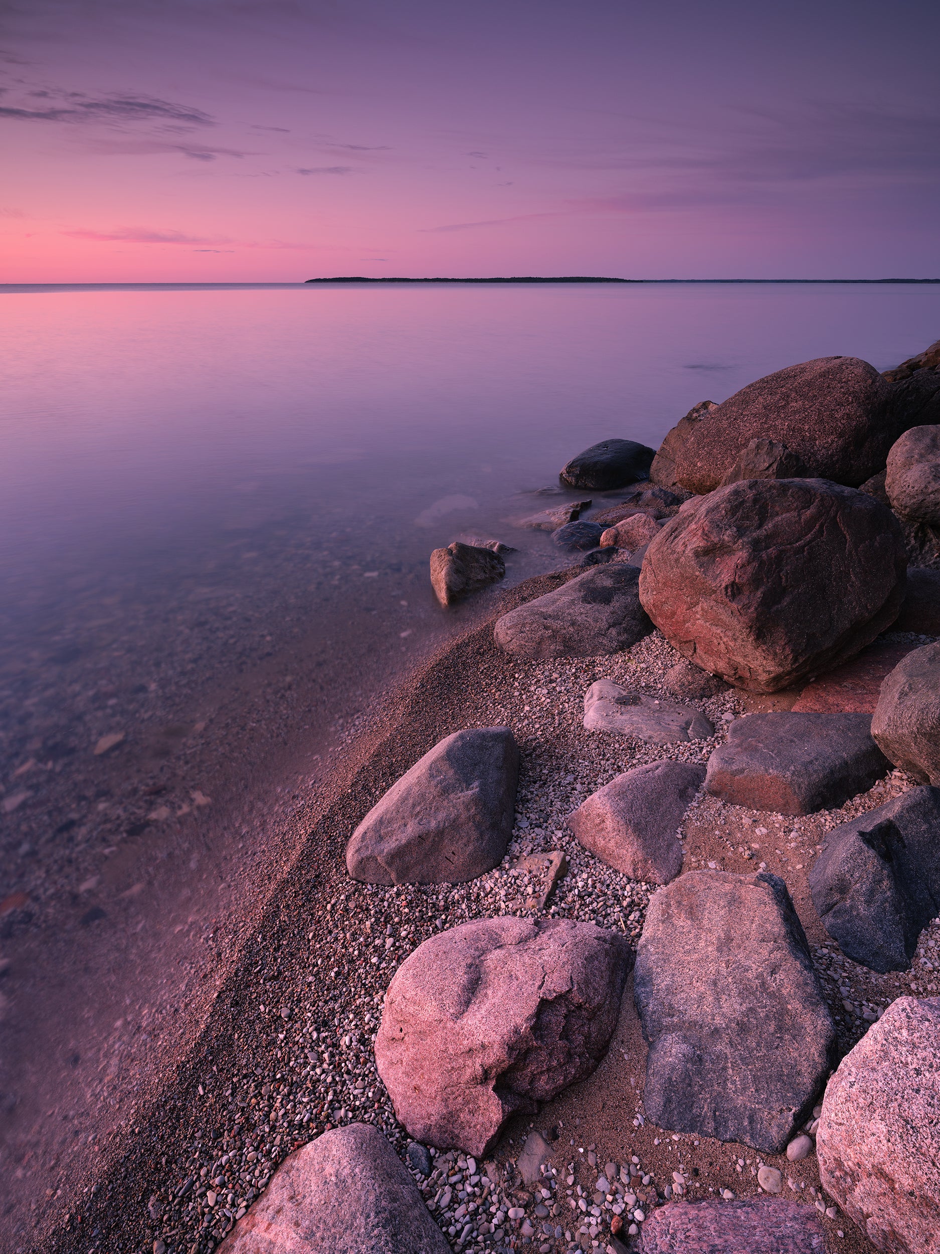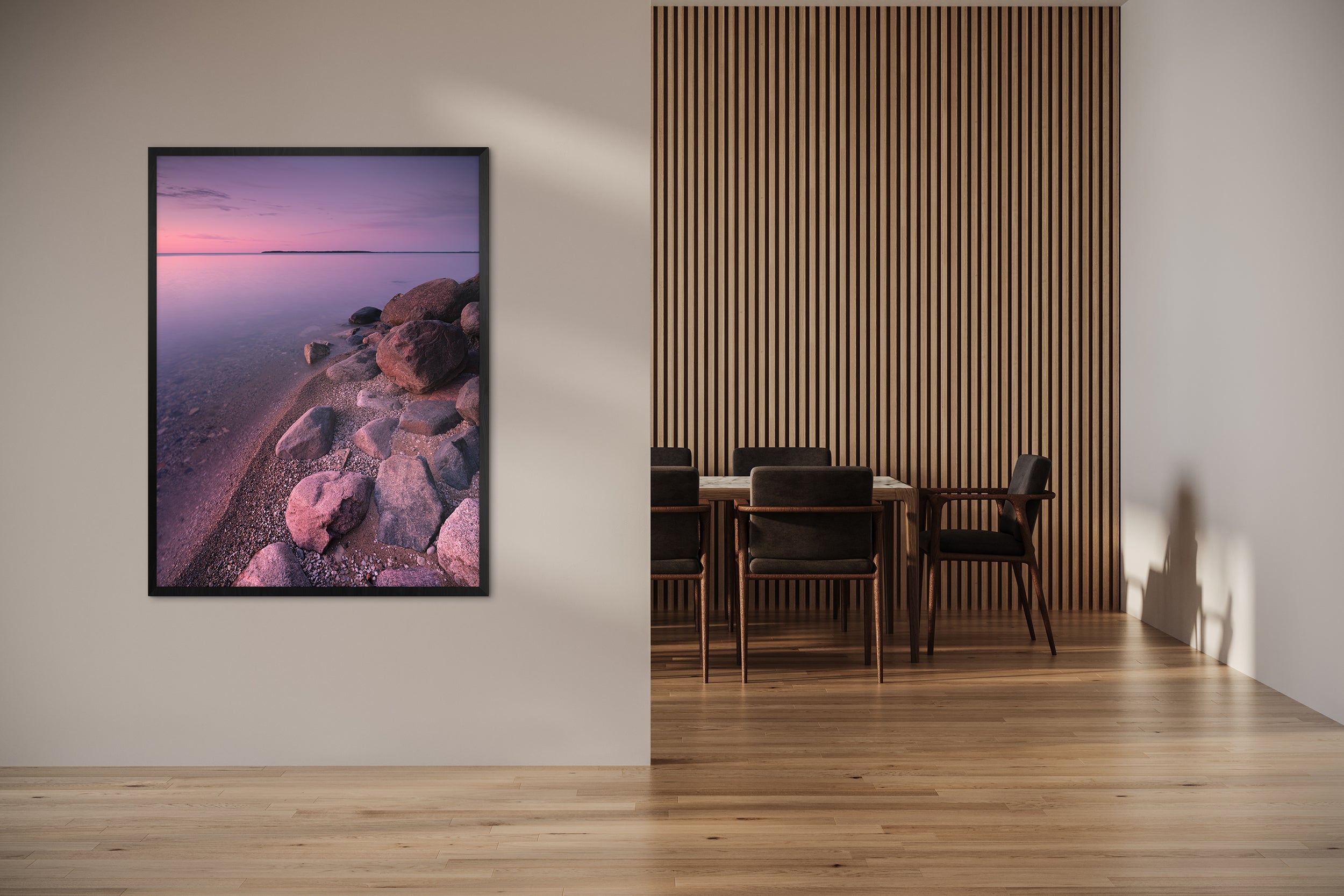 Soft evening light paints the seashore in delicate pink and violet hues. Smooth water meets the textured rocks in perfect harmony, capturing the quiet poetry of the fading day. This fine art print brings warmth and calm – perfect for interiors that embrace tranquility and natural elegance.