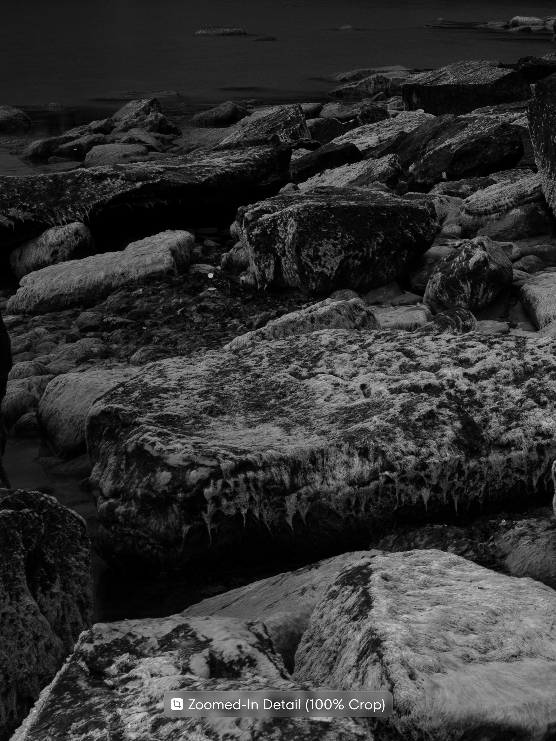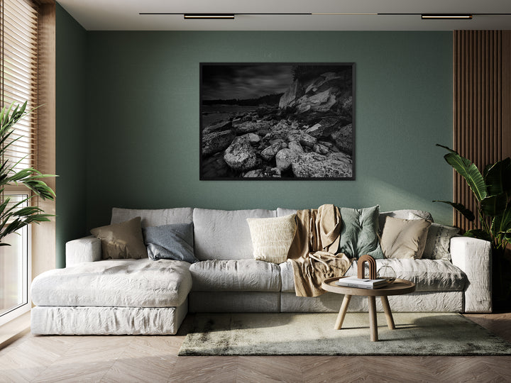 A black and white fine art photograph of the Baltic coast, featuring massive rocks and cliffs illuminated by subtle light. The deep shadows and textures emphasize the rugged beauty and strength of nature. Perfect for adding a dramatic and elegant touch to a living room, office, or bedroom.