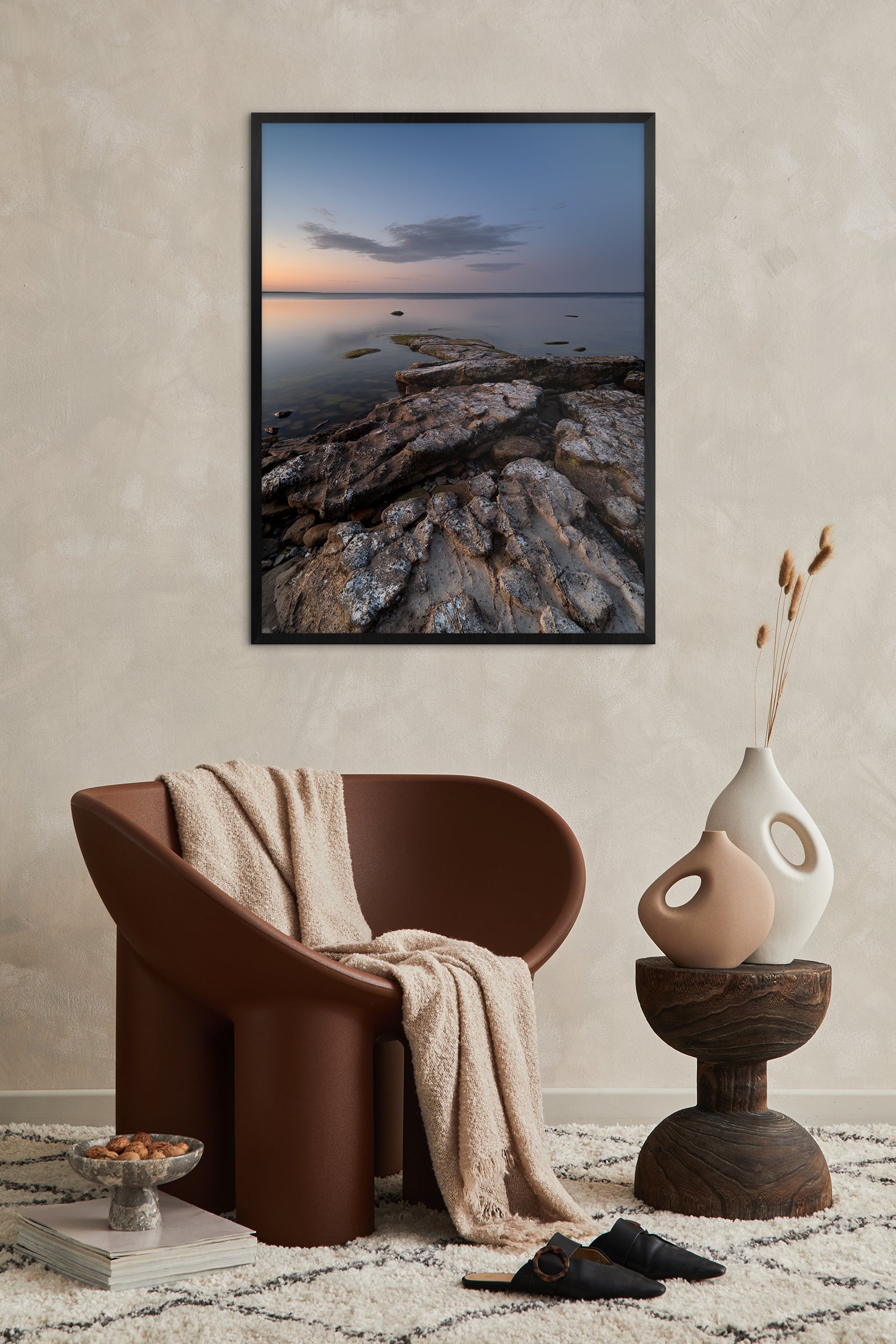 A serene Baltic coastal scene captured at sunset, where warm light gently illuminates the rocky shore. The calm water reflects soft pastel tones of the evening sky, creating a peaceful and balanced composition. Perfect for a living room, bedroom, or office in a modern or Scandinavian style.