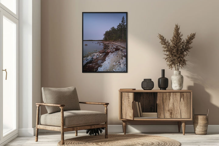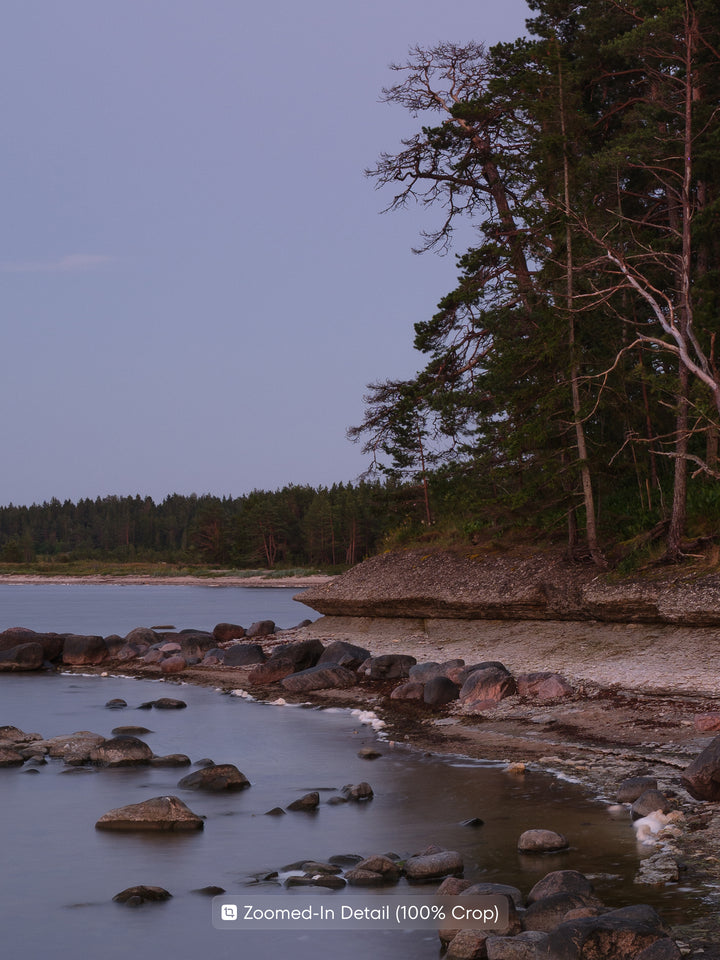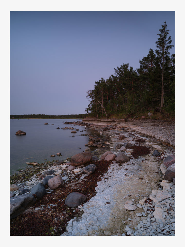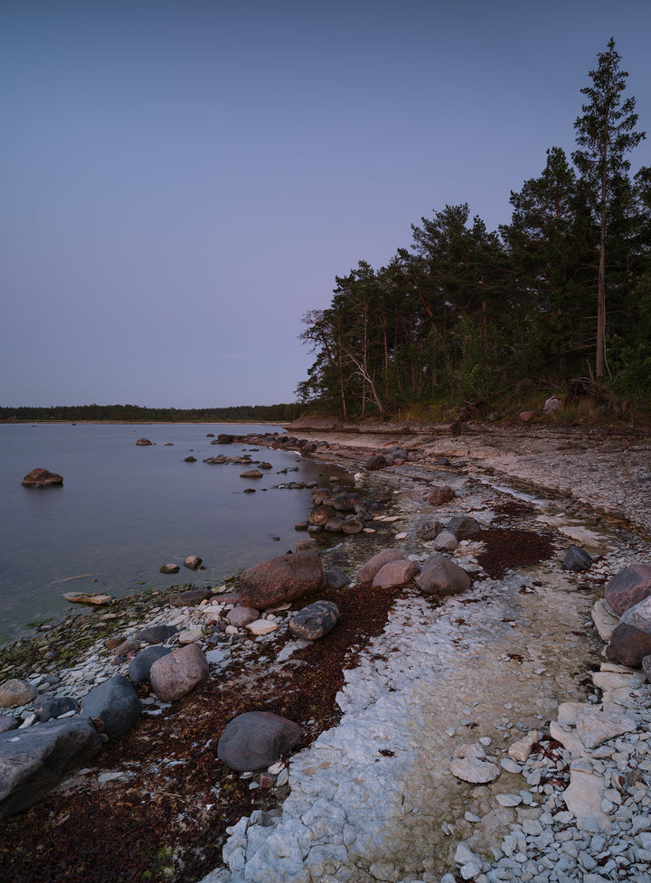 Photograph of a rocky shoreline with a coniferous forest taken in the evening light. The soft illumination gives the stones and water a calm tone. Captured in natural colors, the image reflects the mood of a northern coastal landscape.