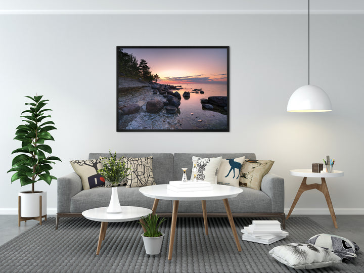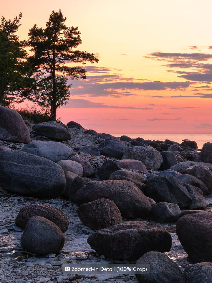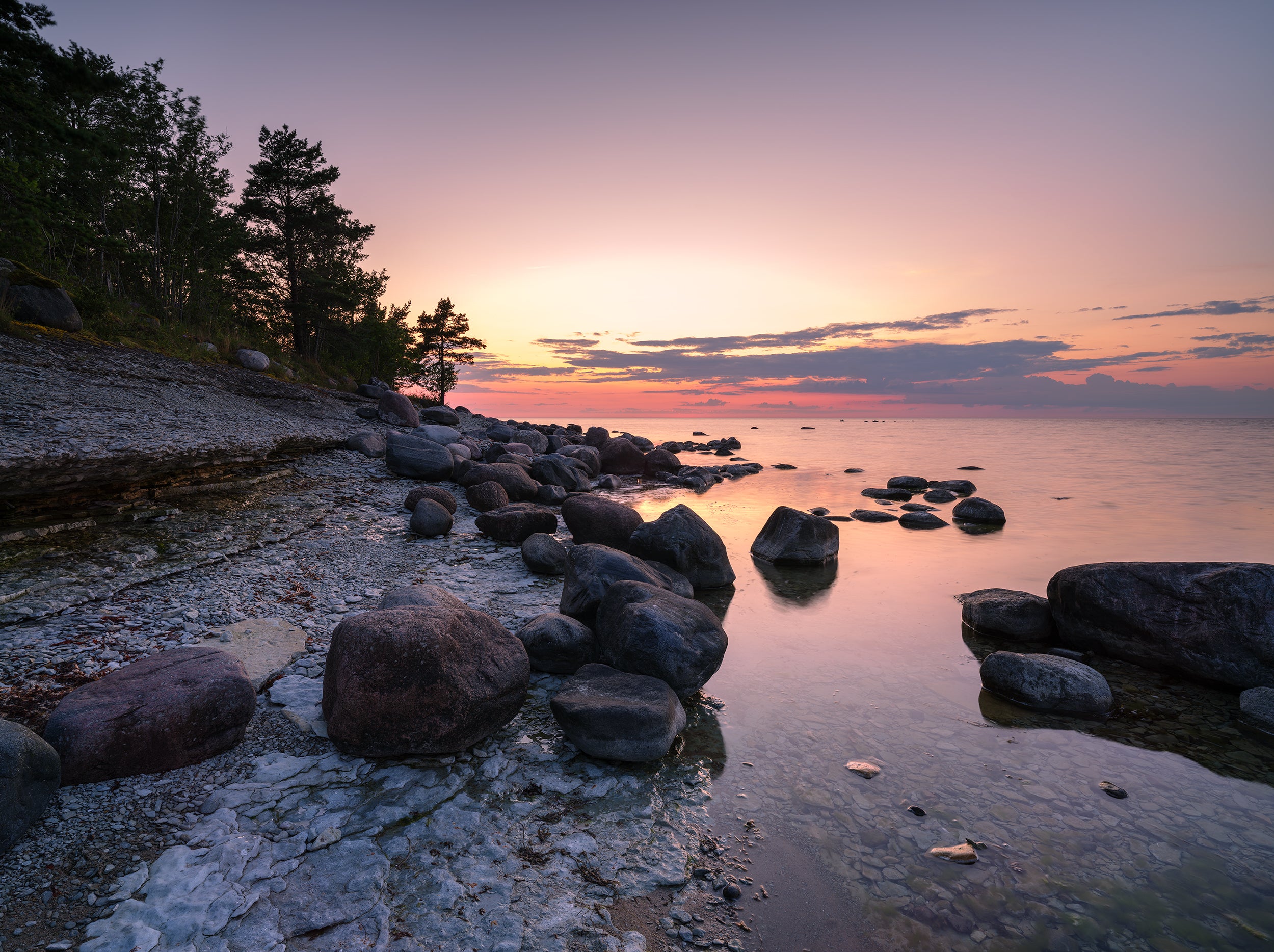 Photograph taken by the sea in the evening. Large boulders are seen along the water’s edge in the foreground. The horizon shows a sunset with pink and orange tones. The water is calm, with trees growing along the shore.