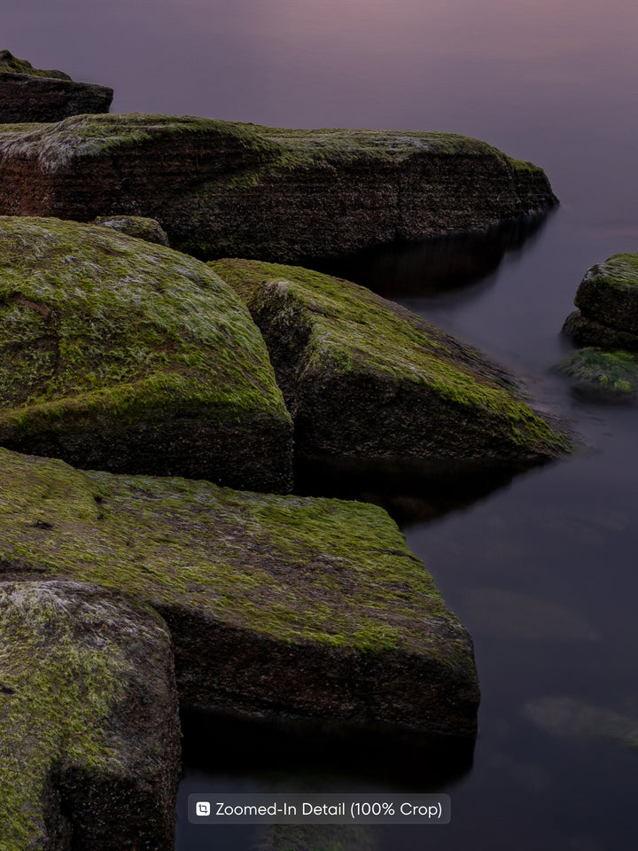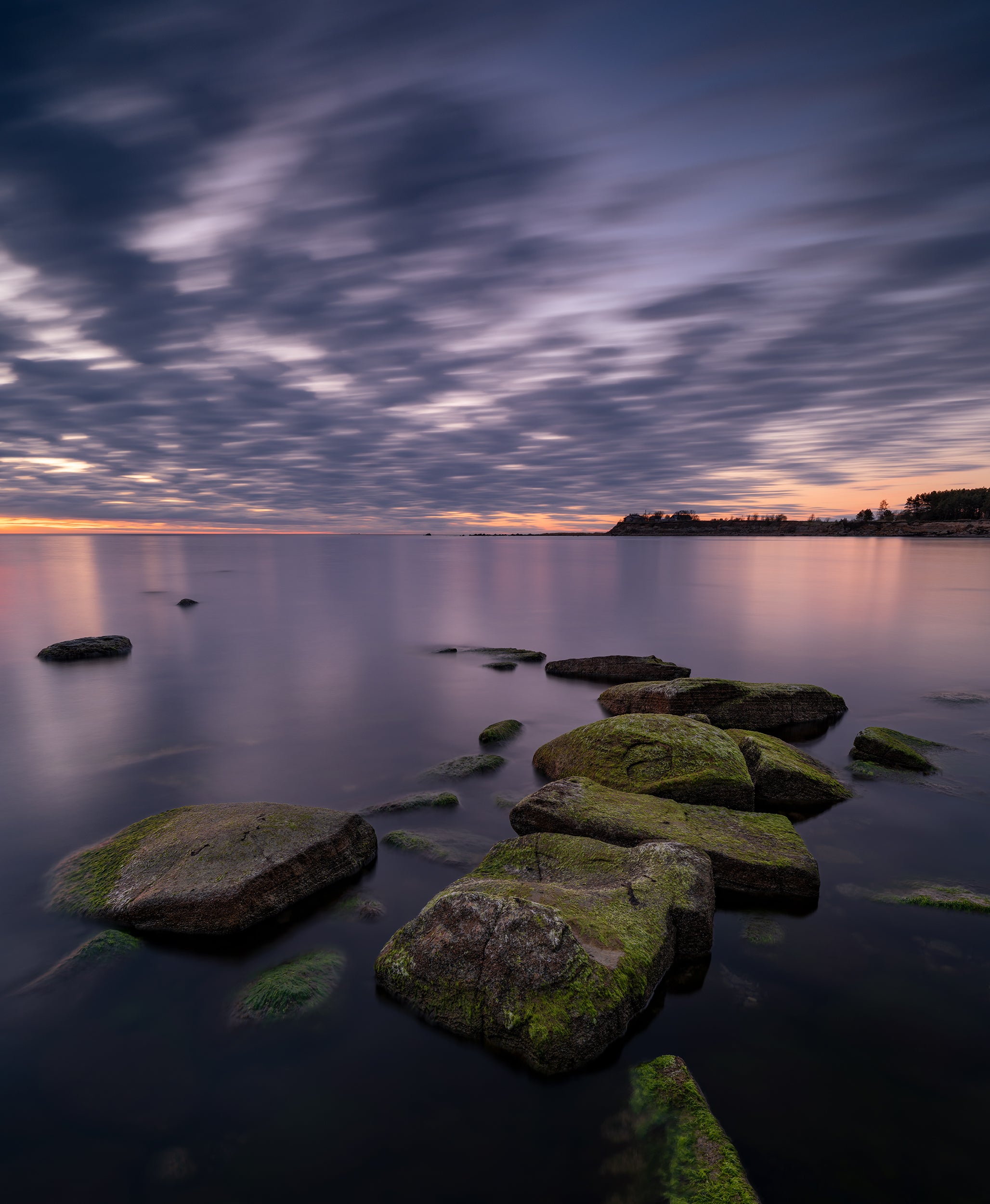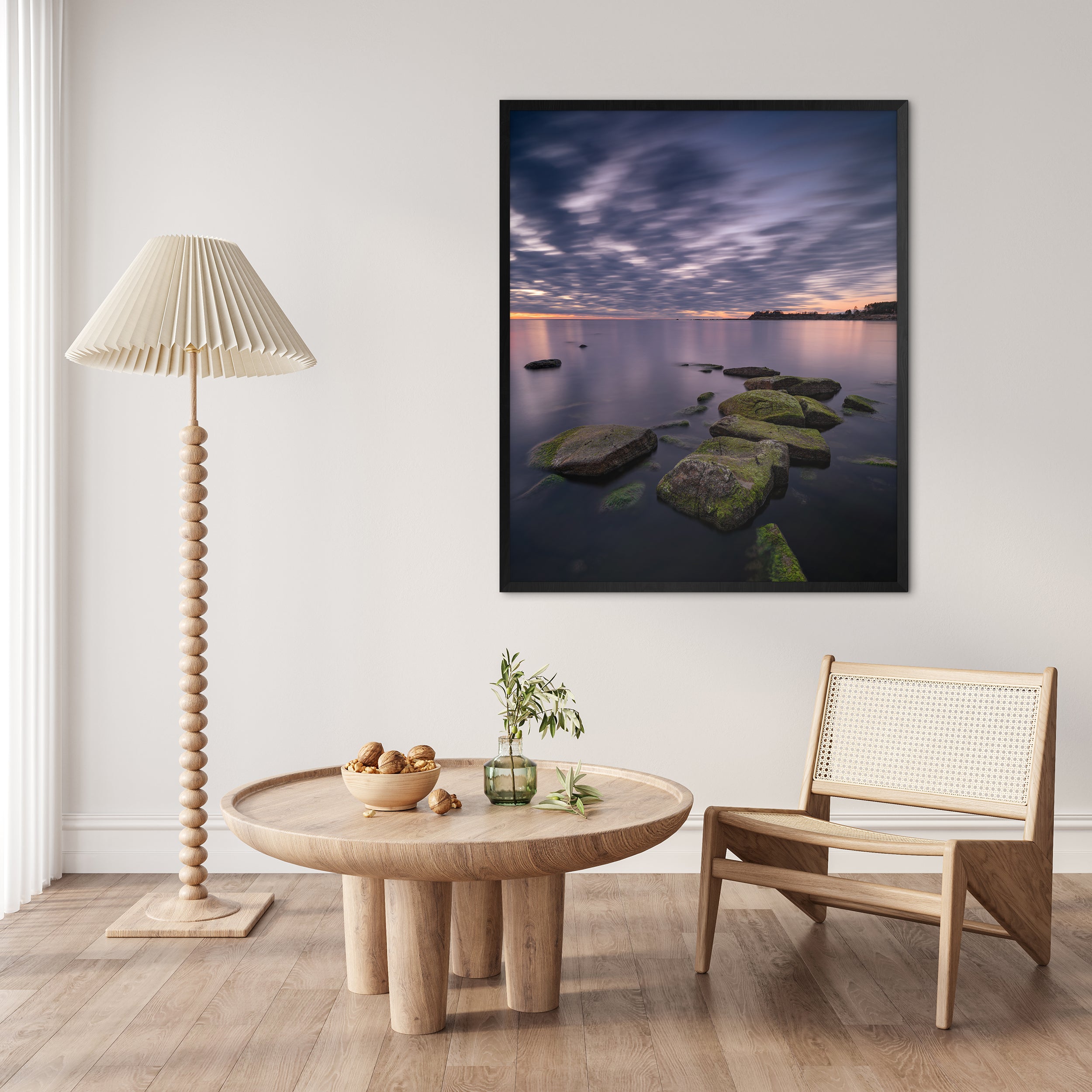 A stunning Baltic coastal landscape captured at sunset, with moving clouds and warm evening light reflecting on the calm sea. The moss-covered rocks in the foreground add depth and texture to the composition. Perfect for adding a sense of tranquility and warmth to a modern living room, bedroom, or workspace.