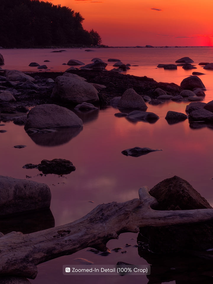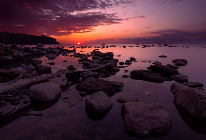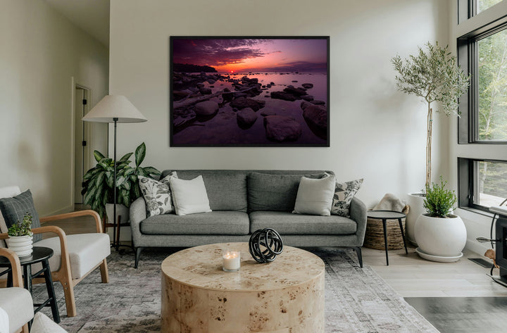 The sun slowly sinks beyond the horizon, painting the sea and sky in deep purple and orange hues. Rocks and driftwood add natural texture, creating an atmosphere of solitude and calm. This poster makes a striking accent for a living room, bedroom, or office, filling the space with the gentle glow of sunset.