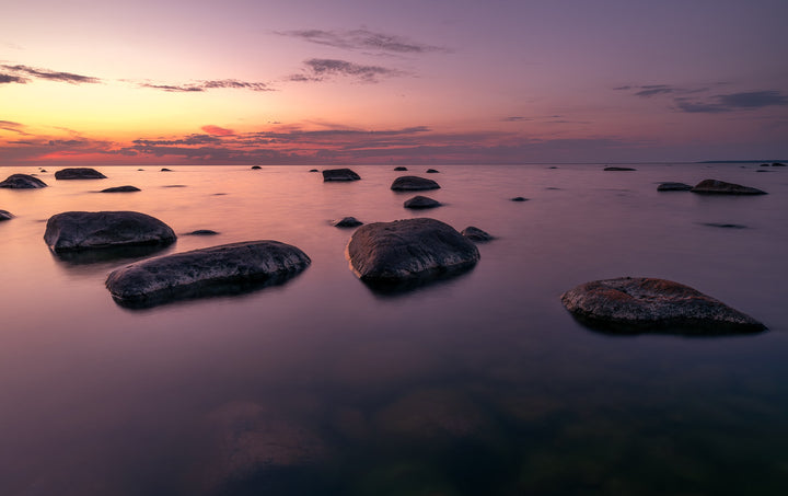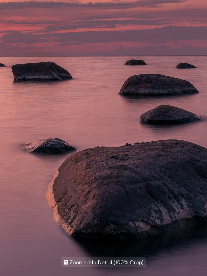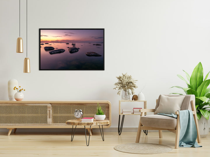 The warm sunset paints the sea and sky in soft pink and purple tones, while rocks emerging from the water create a sense of peace and meditation. The gentle stillness of the water emphasizes the harmony and calm of the landscape. This poster is perfect for a bedroom, living room, or office, adding an atmosphere of coziness and balance to the interior.