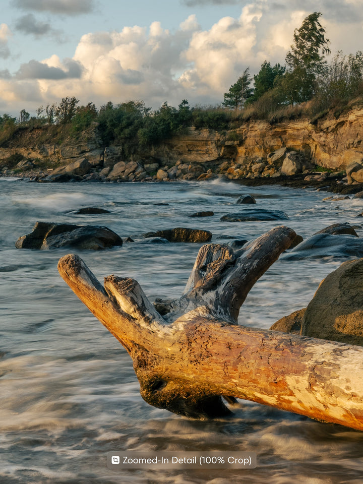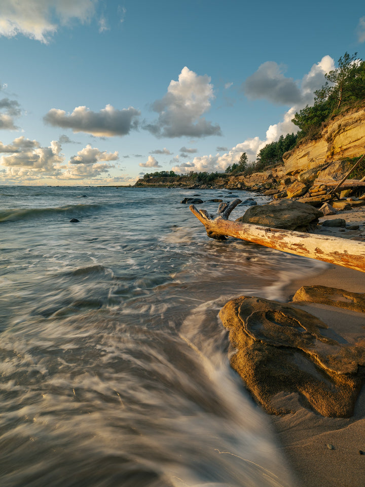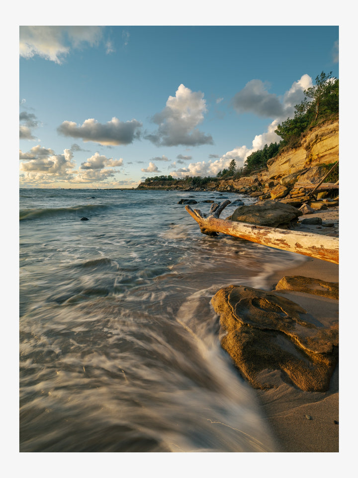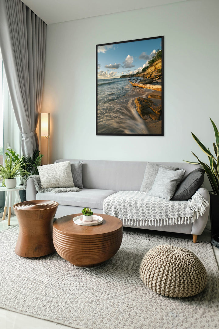 A dynamic scene where sea waves roll onto a sandy shore with rocks and driftwood. Golden sunlight illuminates the cliffs and clouds, capturing both the power of nature and its harmony. This poster is perfect for a living room, office, or country home, adding energy and the atmosphere of the seaside to the interior.
