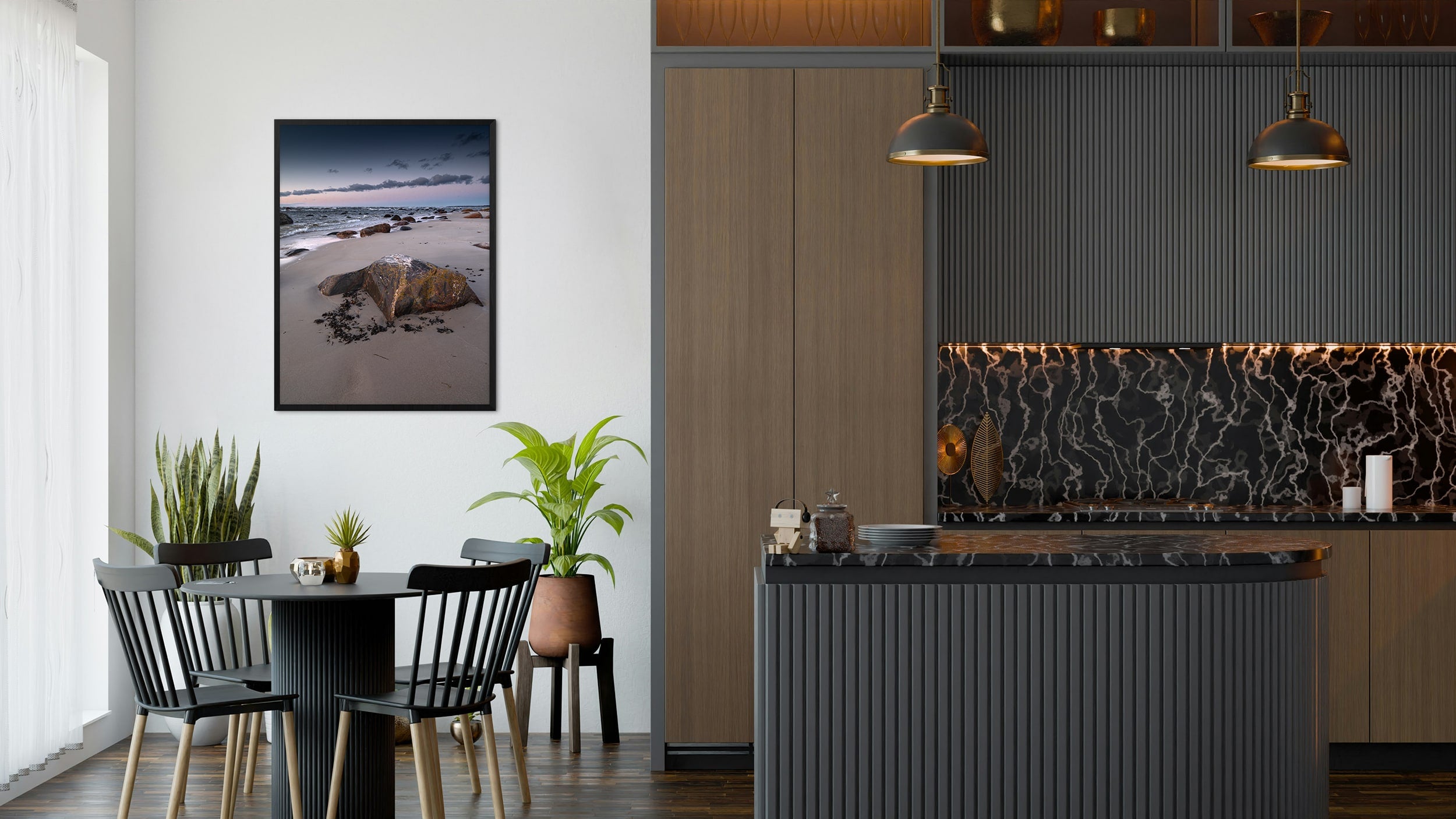 A massive rock on the sandy shore becomes the centerpiece of a calm seascape. Gentle tones of the sky and soft light highlight the natural texture of the rock, creating an atmosphere of serenity. This poster will beautifully complement the interior of a living room, bedroom, or office, adding a touch of nature and comfort.