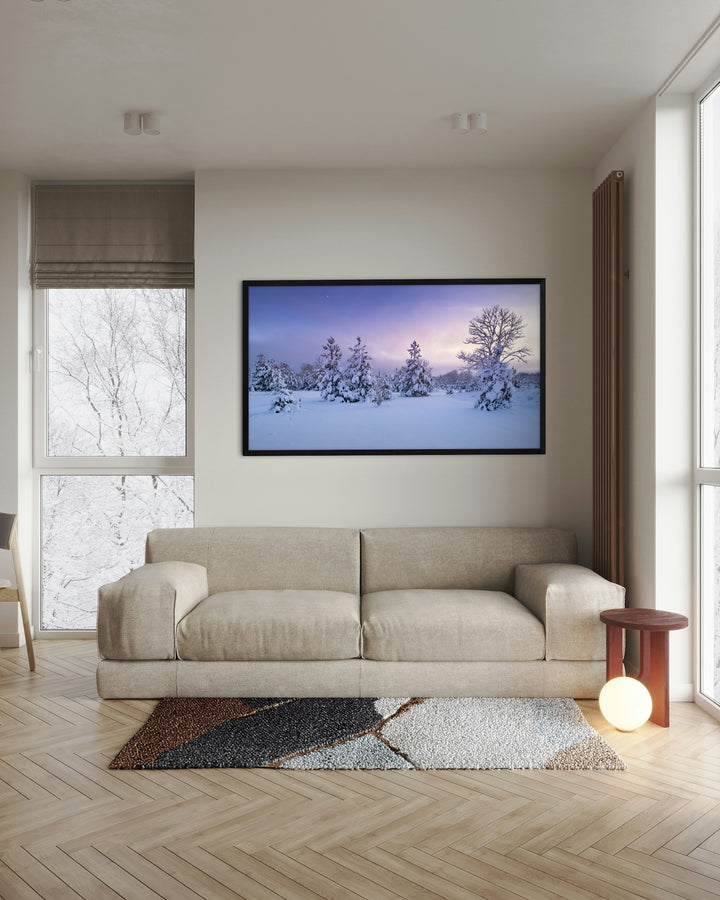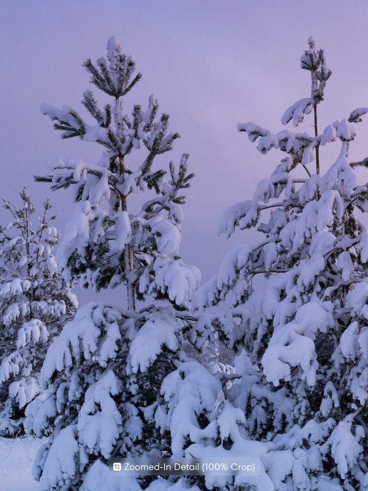 A winter forest is covered in pristine snow, while the horizon glows with gentle purple and pink shades. The moon, barely visible above the trees, adds a sense of silence and solitude to the scene. This poster makes a harmonious accent for a bedroom, living room, or office, filling the space with an atmosphere of calm and winter magic.