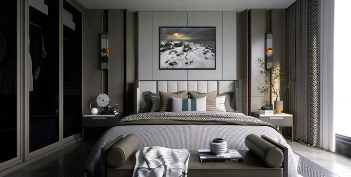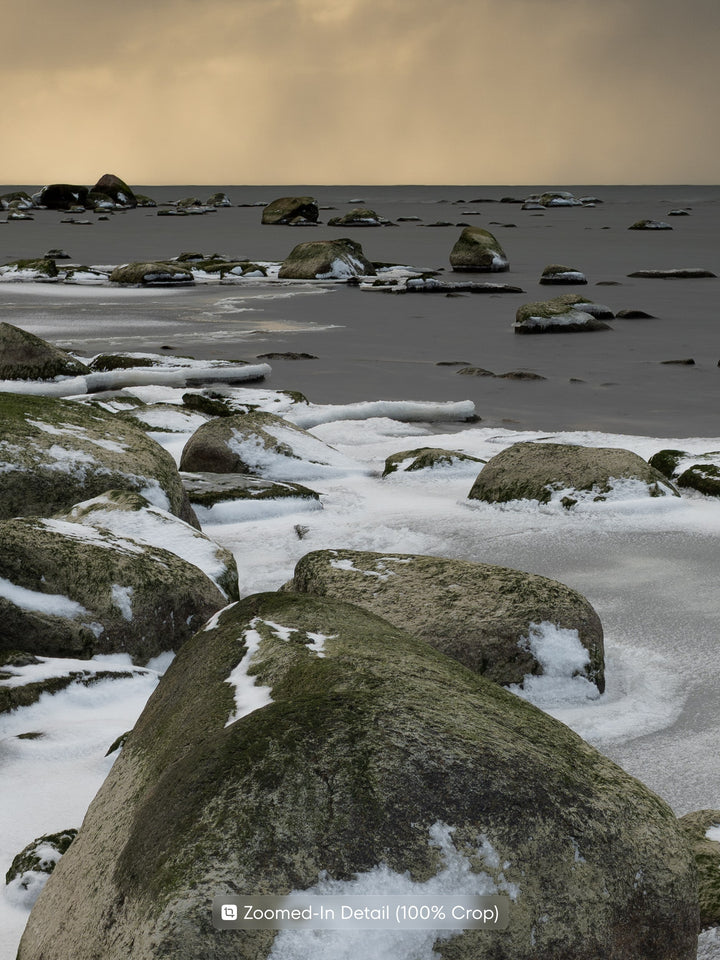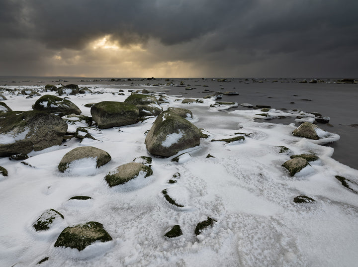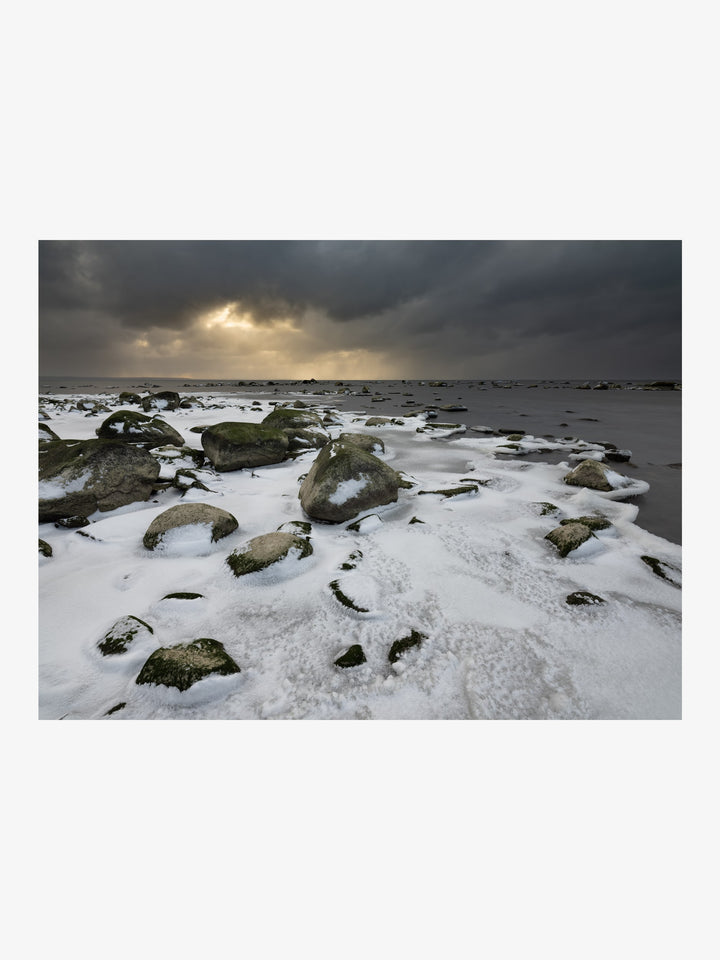 Snow- and ice-covered rocks stretch into the calm sea, while dramatic clouds reveal rays of light on the horizon. The contrast of white snow, dark water, and clouds creates an atmosphere of natural power and grandeur. This poster is perfect for a living room or office, adding depth and expressiveness to the interior.
