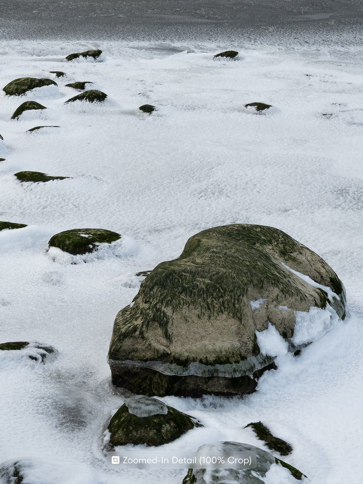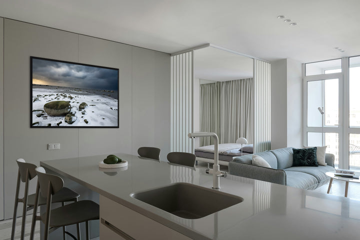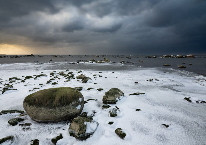 Large rocks, covered with snow and ice, rest along the shoreline leading into the cold sea. On the horizon, rays of light break through heavy storm clouds, creating a dramatic and captivating mood. This poster makes a striking accent in a living room or office, adding depth and the raw power of nature to the interior.