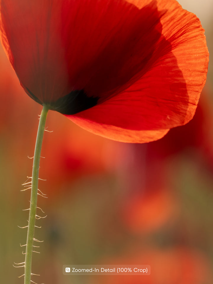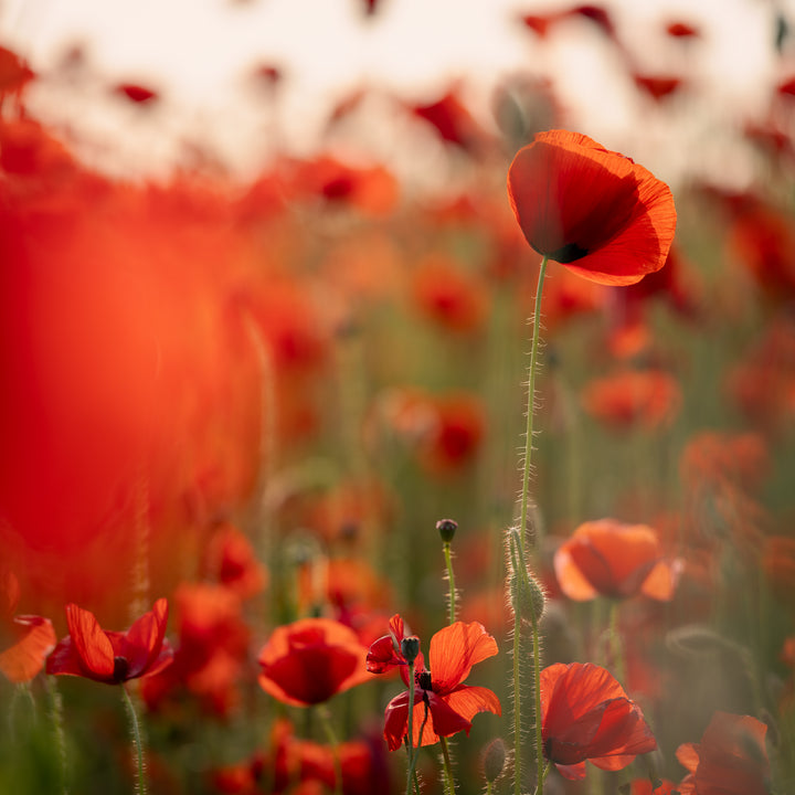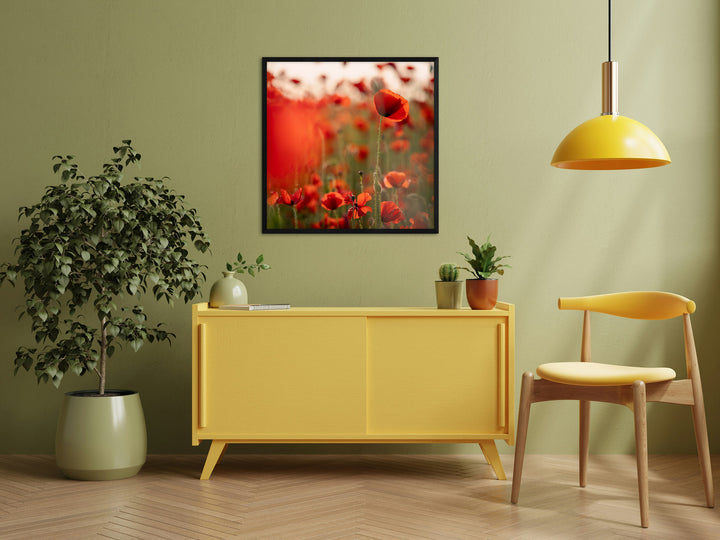 A tall poppy stands out among a sea of scarlet flowers, illuminated by soft sunlight. The warm atmosphere of summer and tenderness makes this artwork perfect for a bedroom, living room, or office. This poster brings harmony and a sense of natural beauty into any space.