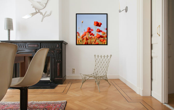 Bright poppies rise above the field, their petals glowing in the sunlight against the clear blue sky. The scene is filled with freshness, freedom, and the warmth of summer. This poster will bring joy and energy into any interior.