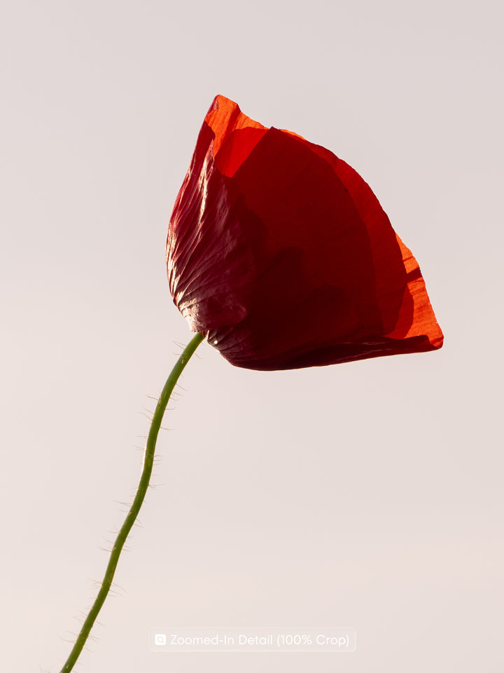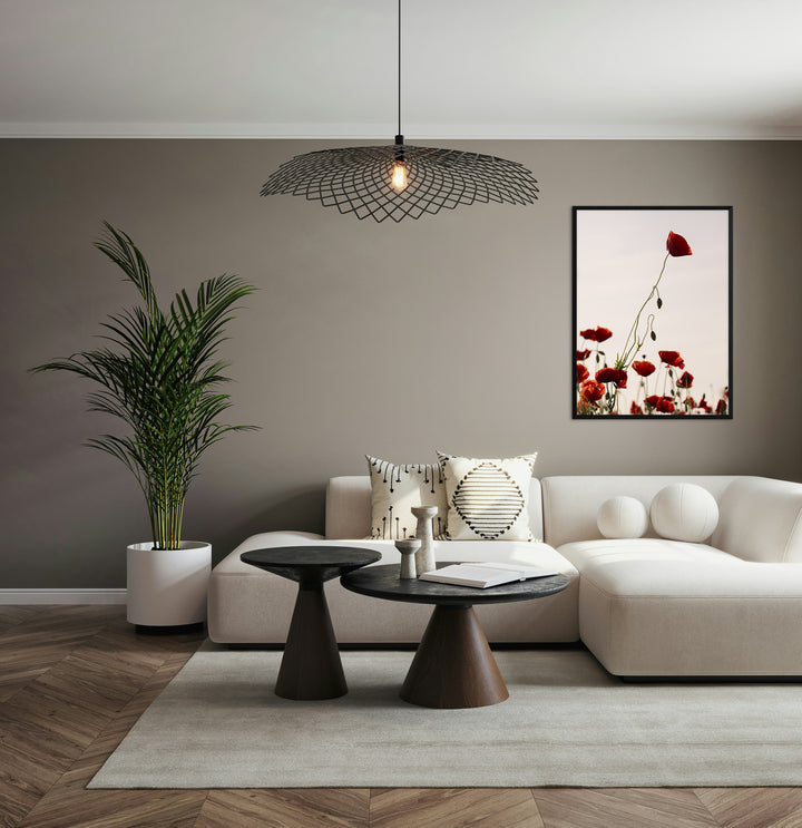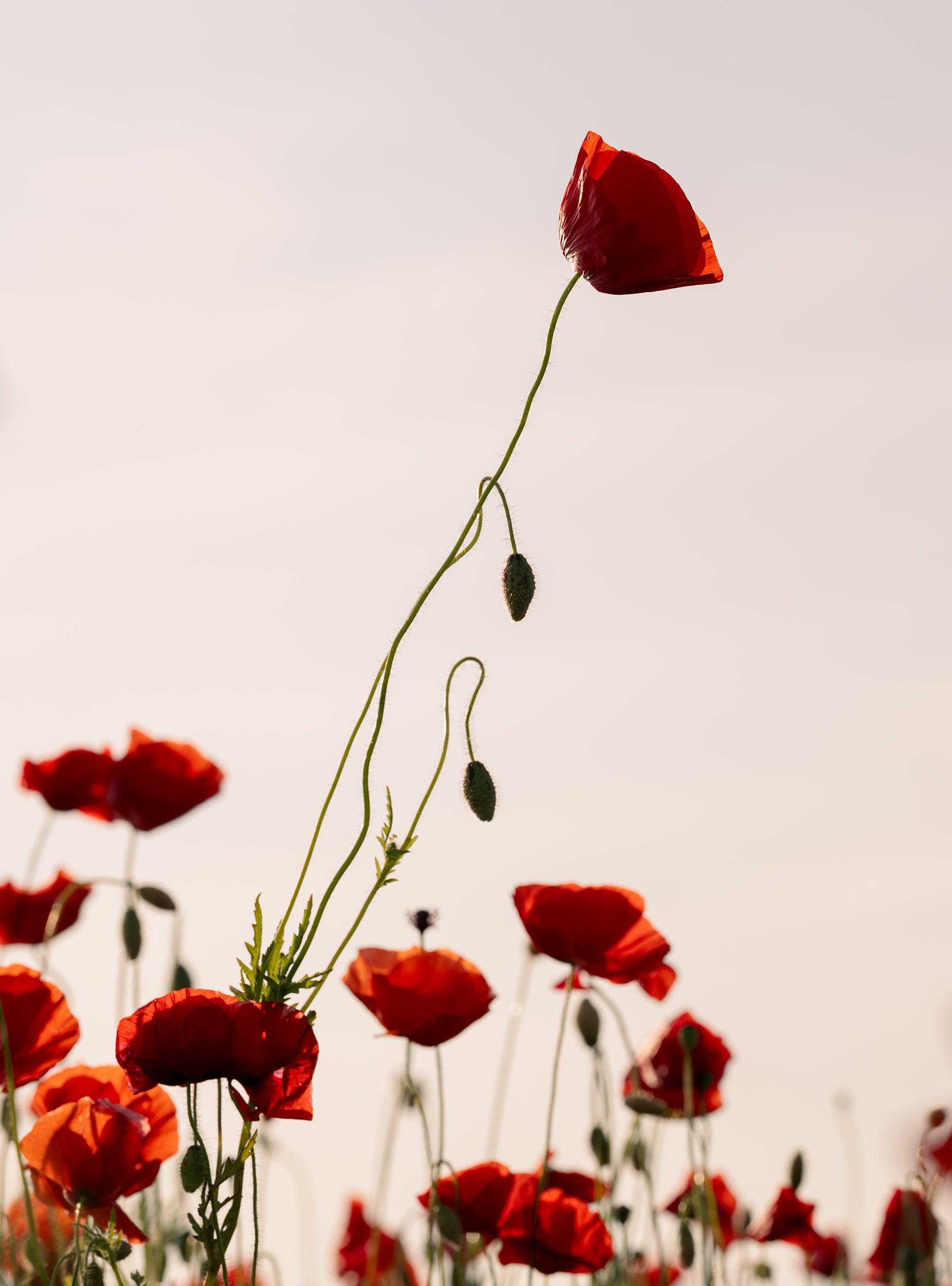 A tall poppy with a bright red bloom rises above many others, standing out in a sea of scarlet flowers. Against the soft sky, it creates a harmonious and inspiring vision of summer nature. This poster will bring freshness and light energy into any interior.