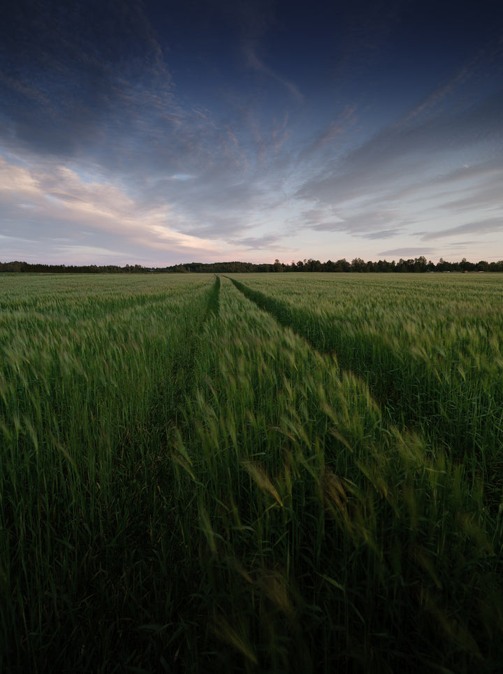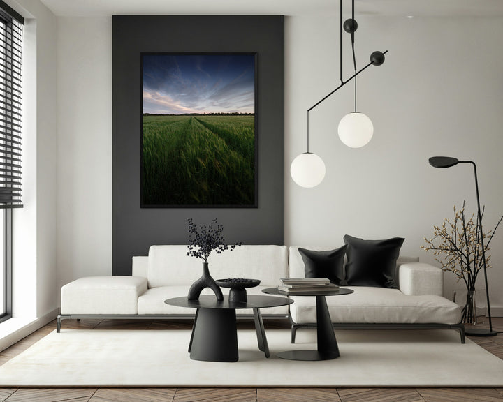 A vast green field with a narrow pathway stretching into the horizon under a gentle evening sky creates a serene and inspiring atmosphere. This landscape conveys harmony, openness, and calm, making it a perfect choice for a living room, bedroom, or office. Bring a touch of nature’s tranquility into your home with this fine art print.