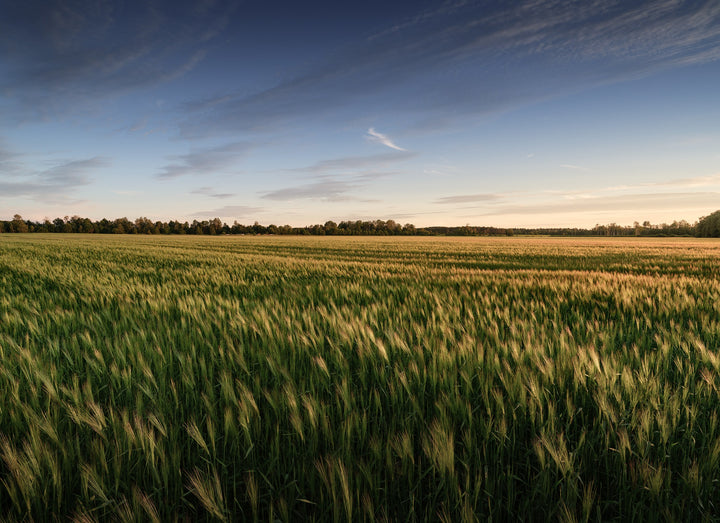 A vast green field under the warm glow of the sunset sky creates a calming and serene atmosphere. Gentle clouds enhance the sense of harmony and depth in this landscape. Perfect for a living room, bedroom, or office, this fine art print brings freshness, openness, and the beauty of nature indoors.