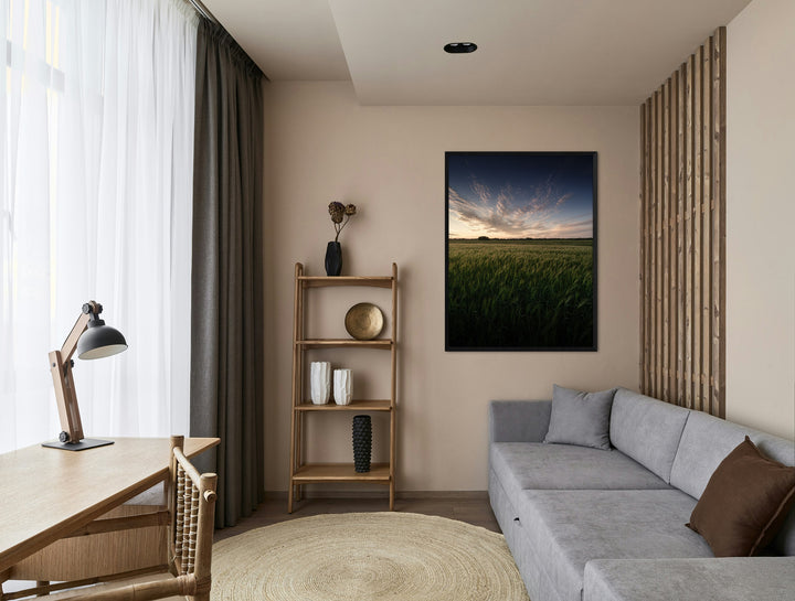 A vast green field swaying in the wind meets a dramatic sky filled with glowing sunset clouds. This landscape evokes freedom, freshness, and inspiration. Perfect for a living room, bedroom, or office, this fine art print brings natural beauty and light into any space.