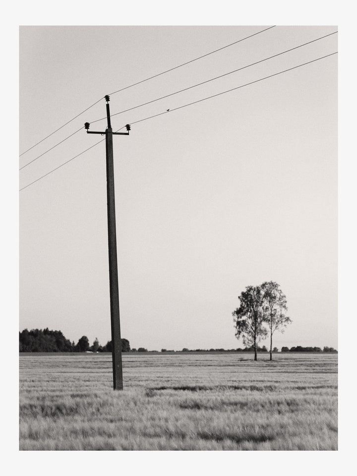 This minimalist landscape juxtaposes nature and industry, with a solitary tree and power pole sharing the quiet field. The monochrome palette enhances the starkness of the scene, giving it a symbolic and thought-provoking atmosphere. Perfect for an office, study, or modern minimalist interior, this fine art print brings depth and meaning.