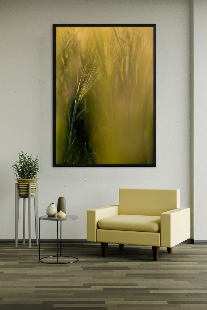 A delicate ear of grain bathed in soft golden sunlight captures the warmth and serenity of summer fields. The blurred background adds depth and a poetic touch, transforming a simple detail of nature into a timeless image. Perfect for a bedroom, living room, or office, this fine art print brings warmth and natural harmony to any space.