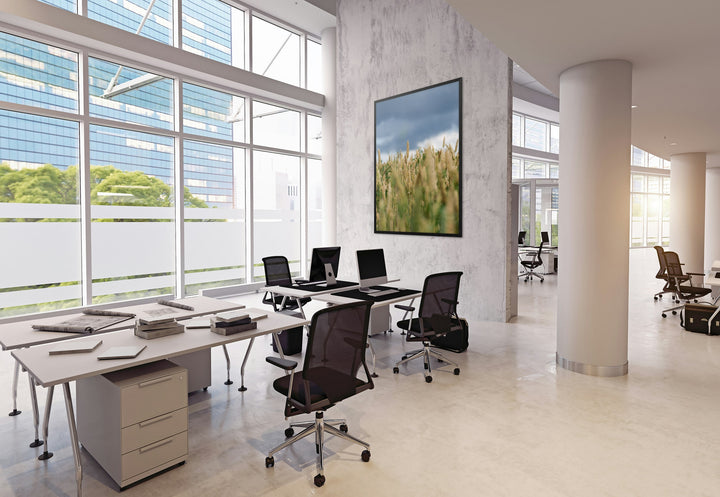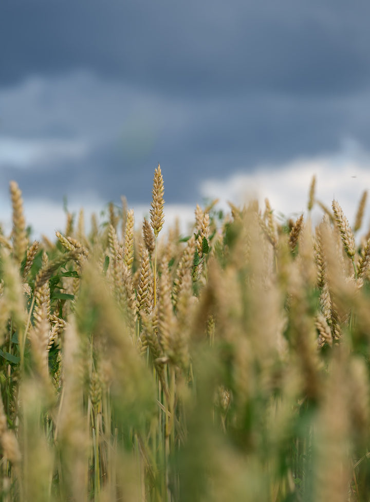 Ripe wheat ears rise against a gray-blue cloudy sky, highlighting the contrast of natural tones. This simple yet striking view captures the beauty of the rural landscape. Perfect for a kitchen, living room, or rustic-style interior.