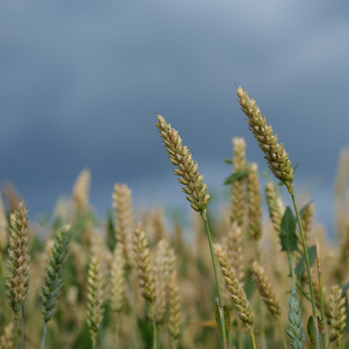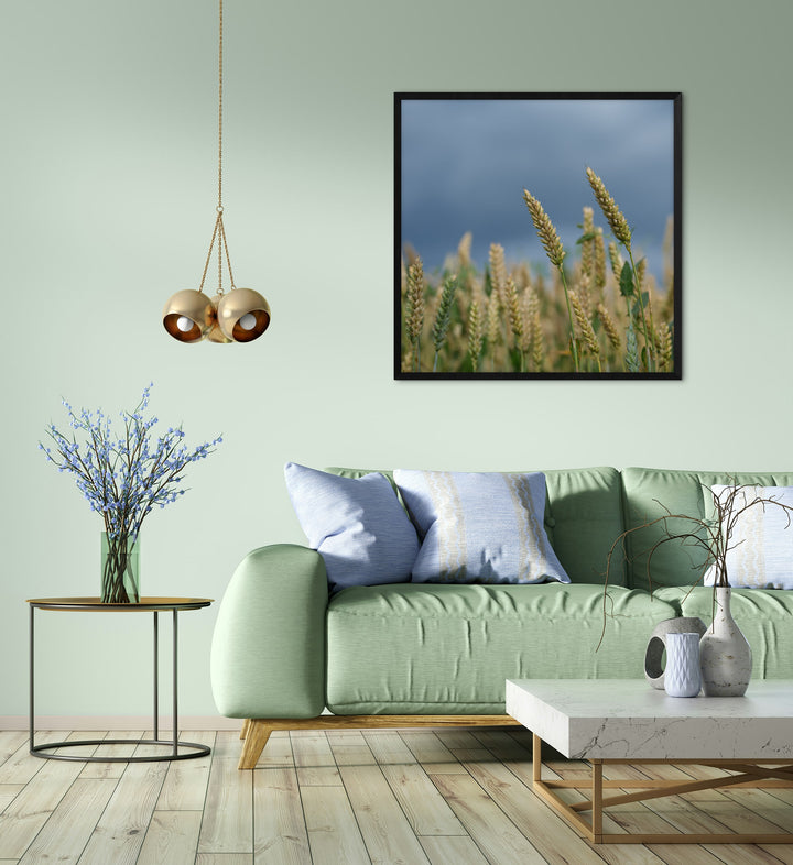 Two wheat ears stand out against the field and the blue sky. The clear details and natural tones emphasize the beauty of the summer harvest. Perfect for a kitchen, dining area, or nature-inspired interior.