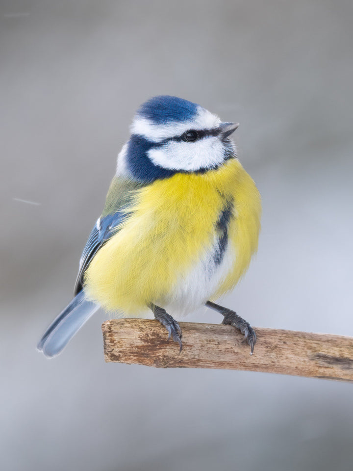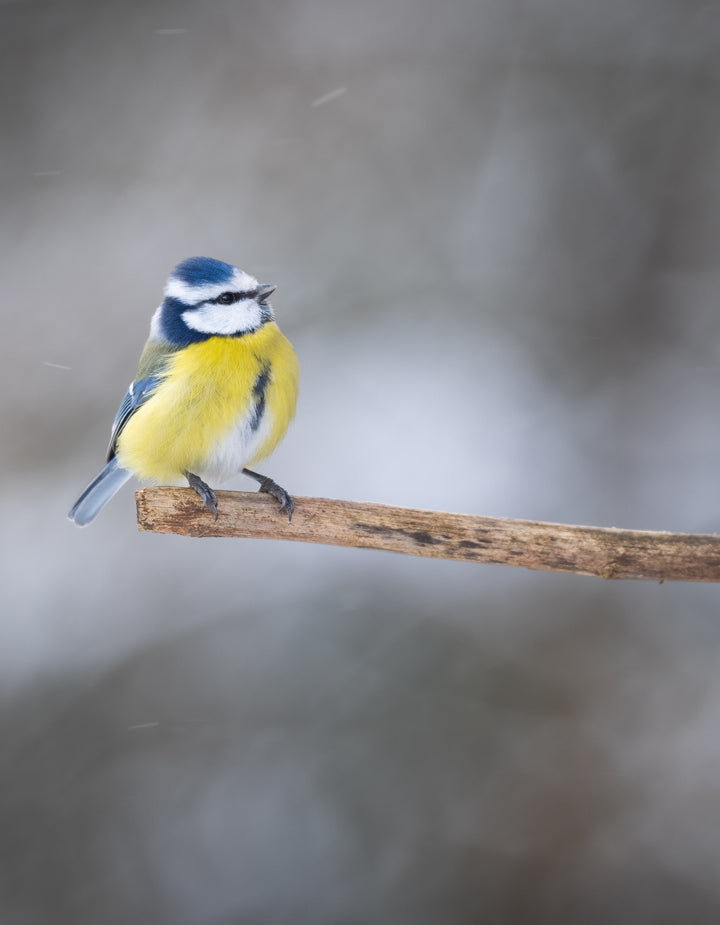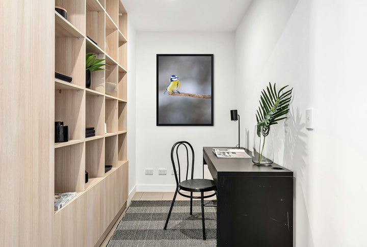 A vivid Eurasian blue tit with a bright yellow chest and blue crown rests gracefully on a branch against a soft winter background. This fine art print radiates the lightness and freshness of nature, bringing a sense of peace and harmony to any interior. Perfect for living room, bedroom, or office wall decor, it adds a colorful yet serene touch.
