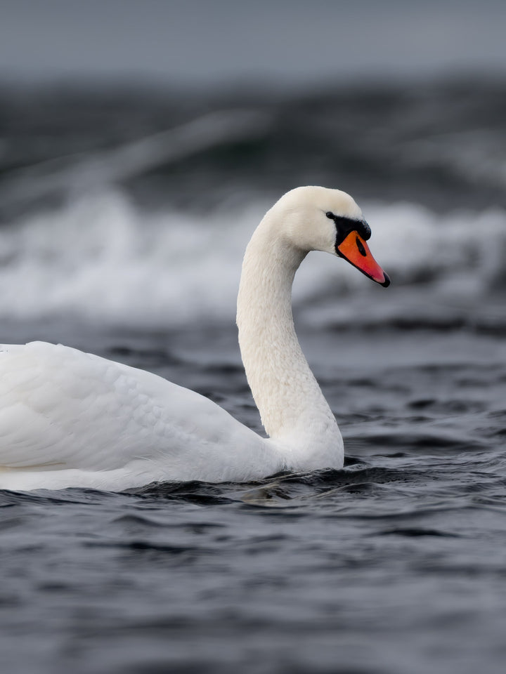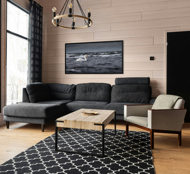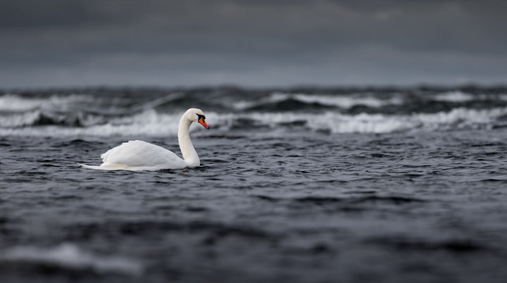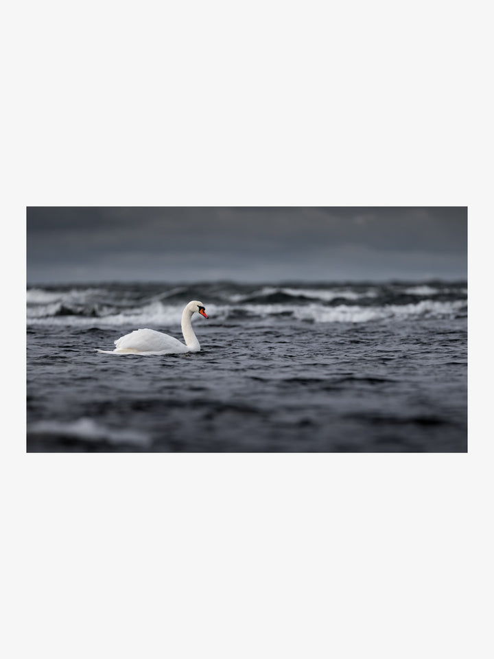 A graceful mute swan glides across the dark sea waves beneath a dramatic sky. The contrast of its pure white plumage against the deep water tones evokes both serenity and power. This fine art print is a striking choice for living room, bedroom, or office wall decor, bringing elegance and a sense of freedom to your space.