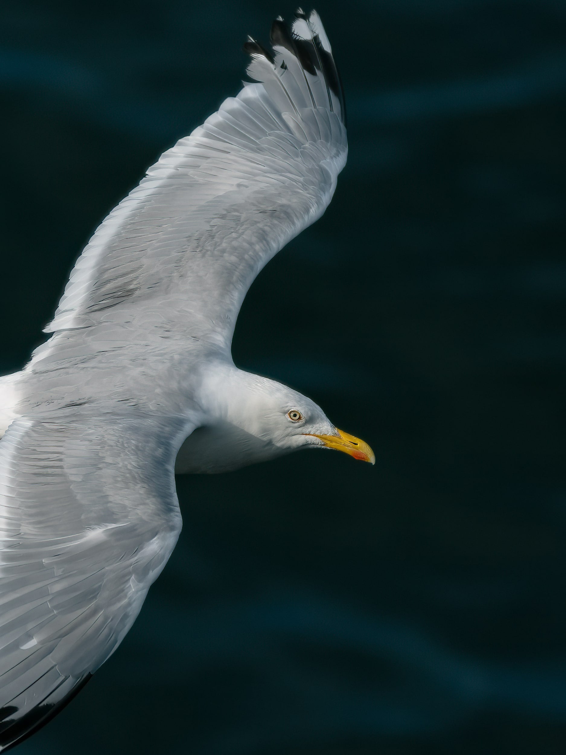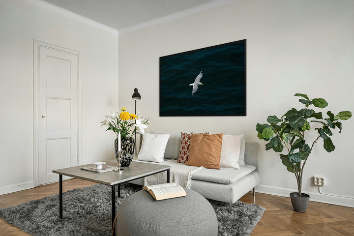 A light-colored gull soars above the dark sea, symbolizing freedom and ease. The contrast of the bird’s silhouette against the deep water creates a striking minimalist composition. This fine art print is a refined choice for living room, bedroom, or office wall decor, bringing a sense of openness and the calm spirit of the sea breeze into your space.