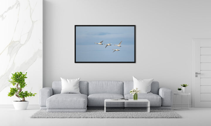 Four white mute swans fly gracefully in the blue sky, forming a refined and minimalist composition. The clean silhouettes and serene background highlight the harmony and calm beauty of nature. This fine art print is a stylish choice for living room, bedroom, or office wall decor, bringing lightness and elegance into any space.