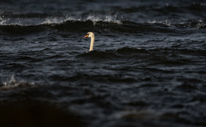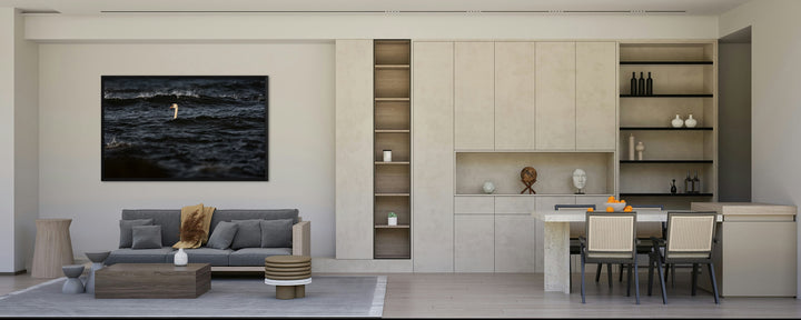 A white swan swims among sea waves, its silhouette standing out against the dark water. This minimalist fine art print highlights the beauty of nature and is perfect for living room, bedroom, or office wall decor.