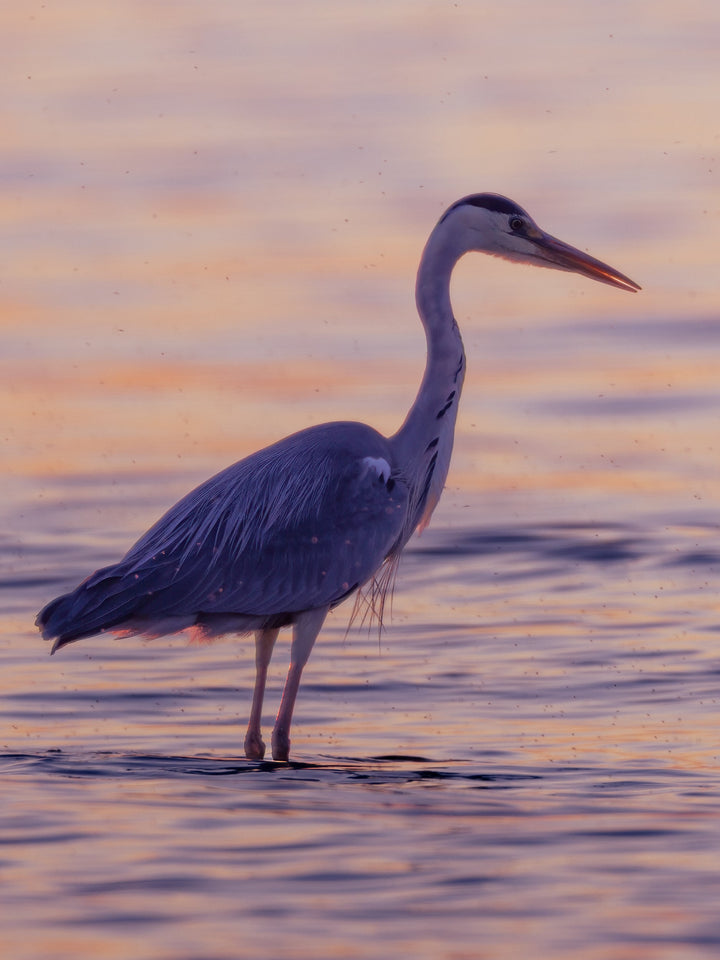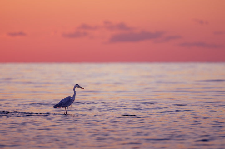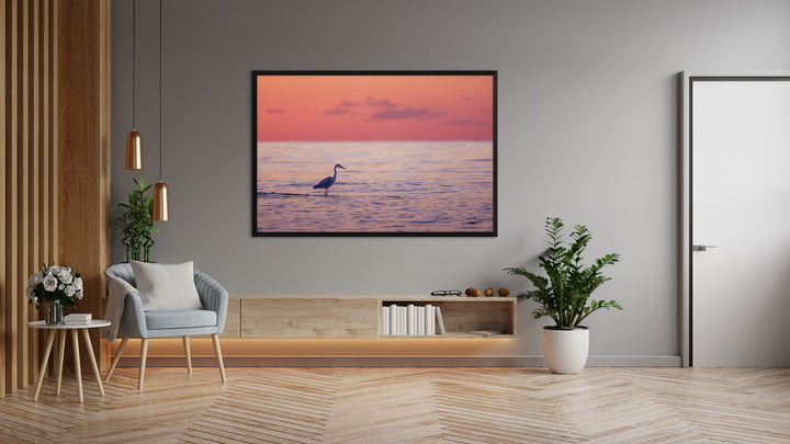 A grey heron stands in the water against the pink colors of a sunset sky. The soft tones and simple composition highlight the beauty of the bird and the calm seascape. This fine art print is an ideal choice for living room, bedroom, or office wall decor.