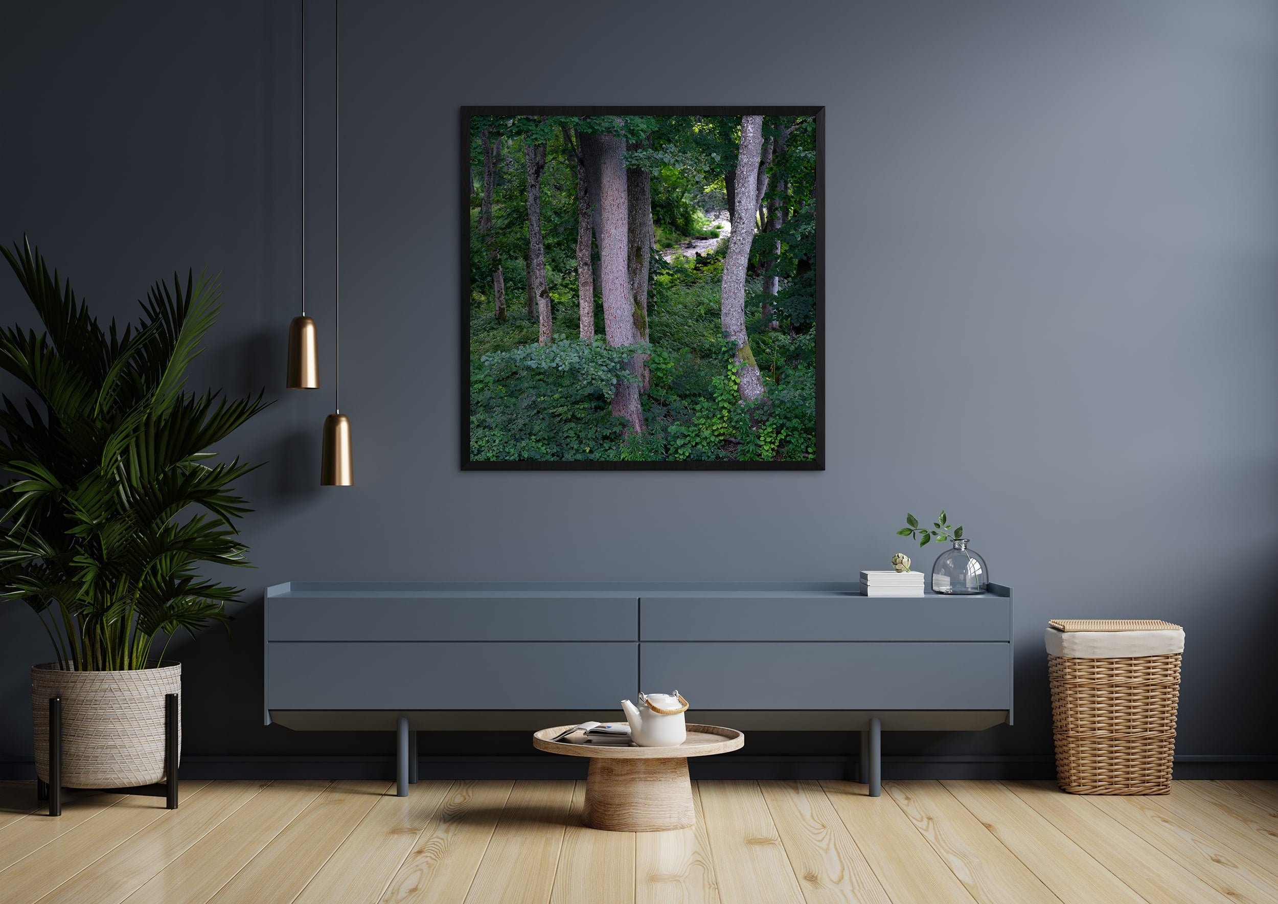 Tree trunks and dense foliage form a vivid scene of a summer forest, with a bright stream visible in the background. The mix of greenery and tree textures highlights the natural beauty of the landscape. This fine art print is a perfect choice for living room, bedroom, or office wall decor.