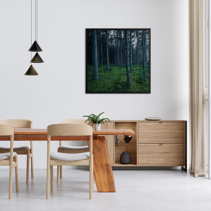 Tall spruces create strict vertical lines, while the ground is covered with lush green moss. The depth of the forest emphasizes the natural harmony of nature. This nature fine art print is a perfect choice for living room, bedroom, or office wall decor.