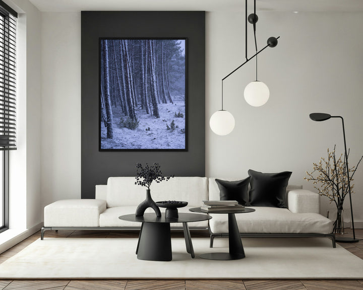 Tall tree trunks are covered with snow, and the ground lies under a white blanket. The strong composition highlights the beauty of the winter forest and the graphic lines of nature. This landscape fine art print is a perfect choice for living room, office, or study wall decor.